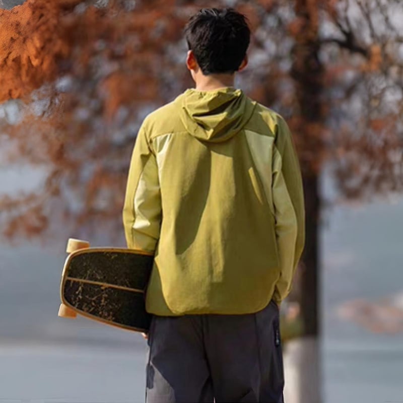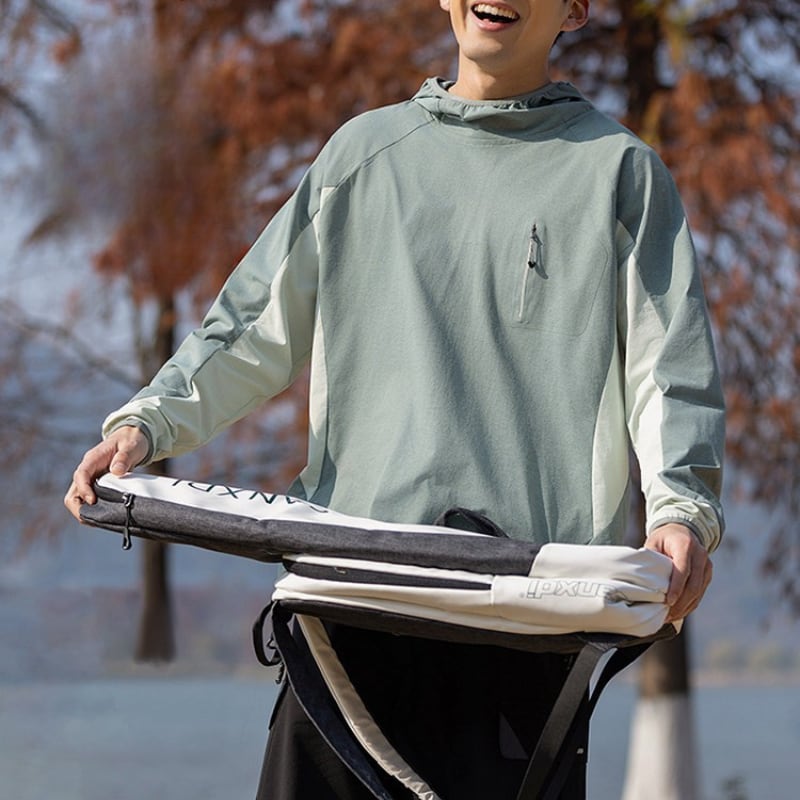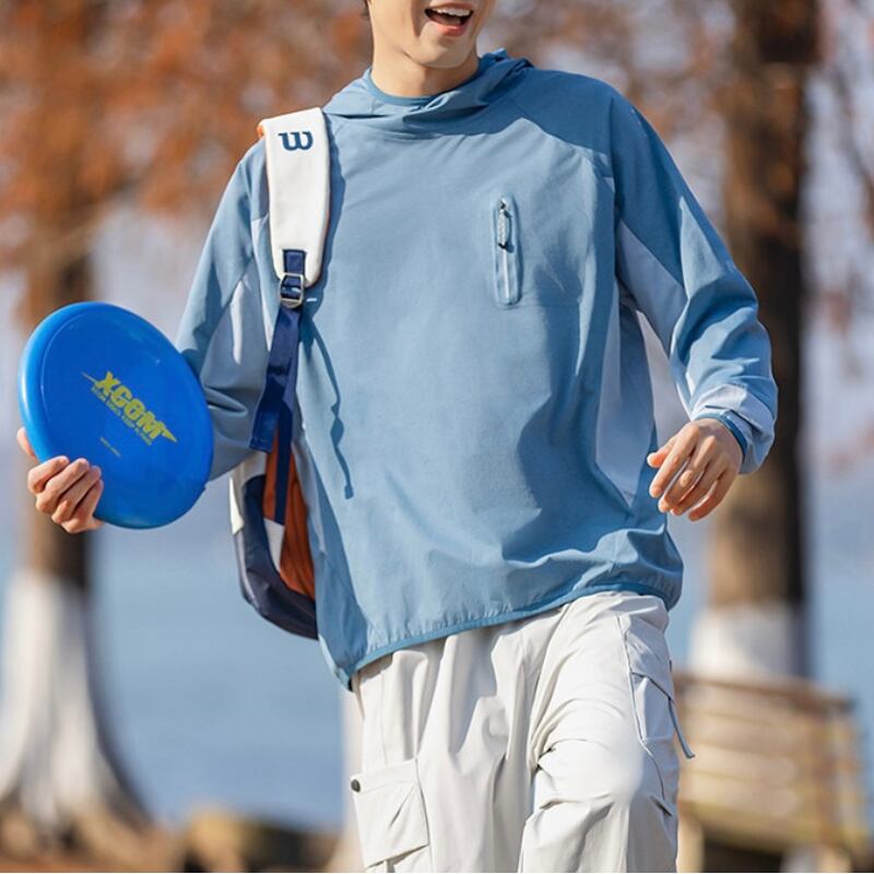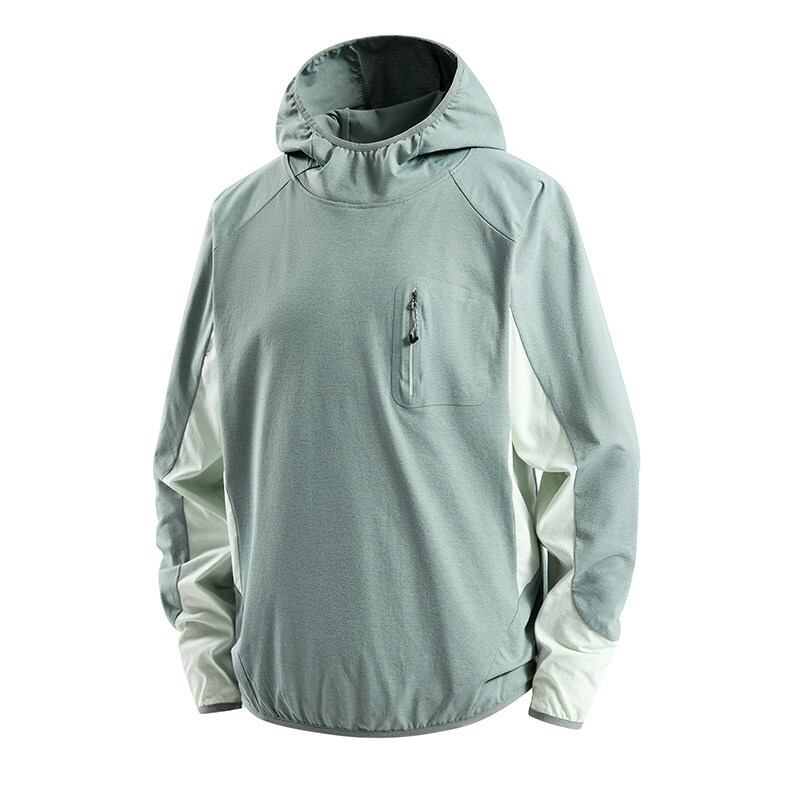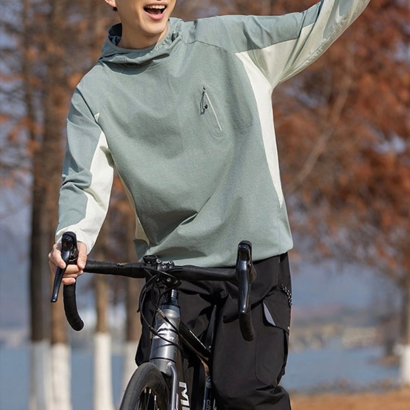 胸元ジップポケットと配色切り替えがアクセントになり、アウトドアスタイルにも馴染むデザイン。