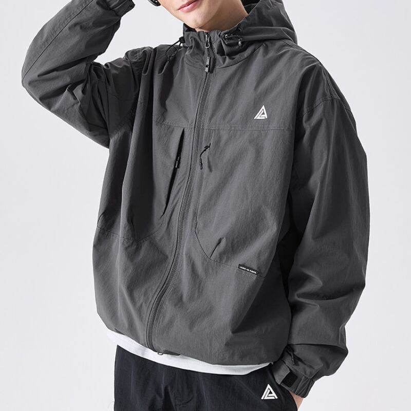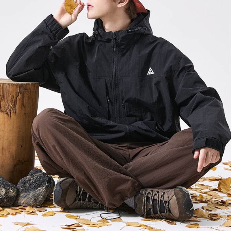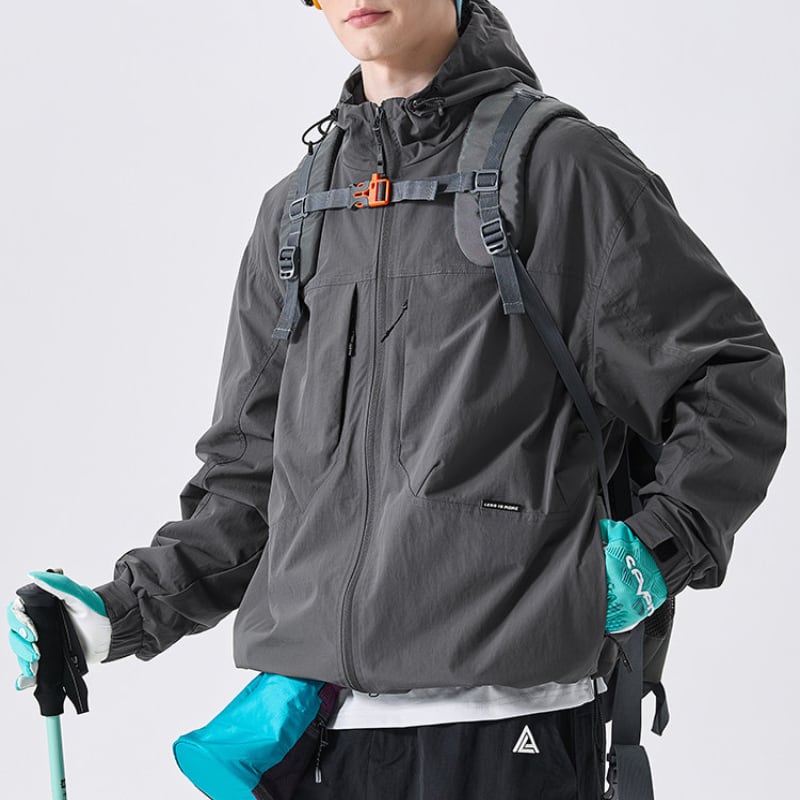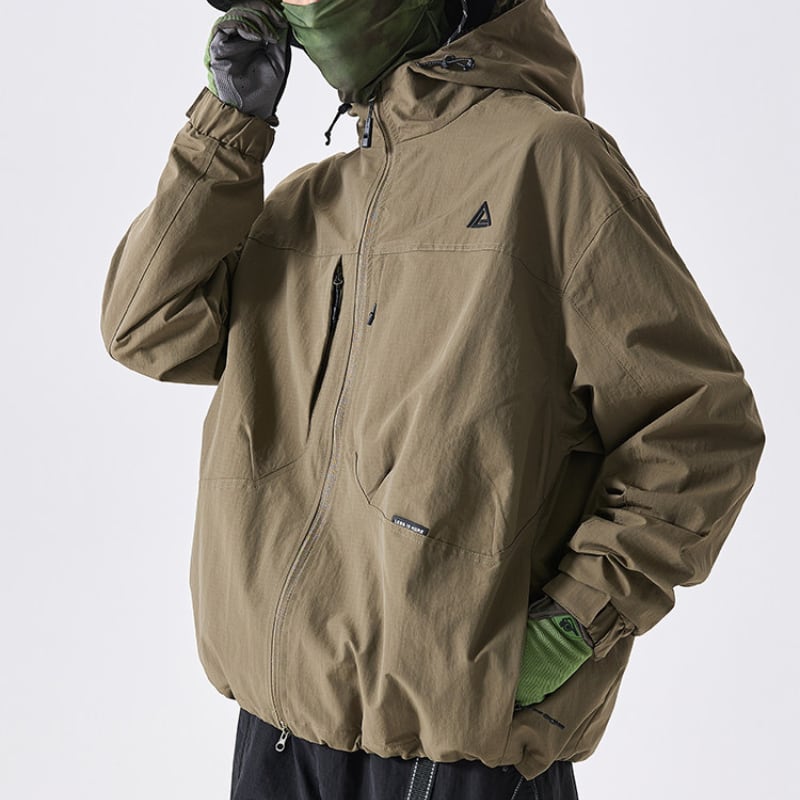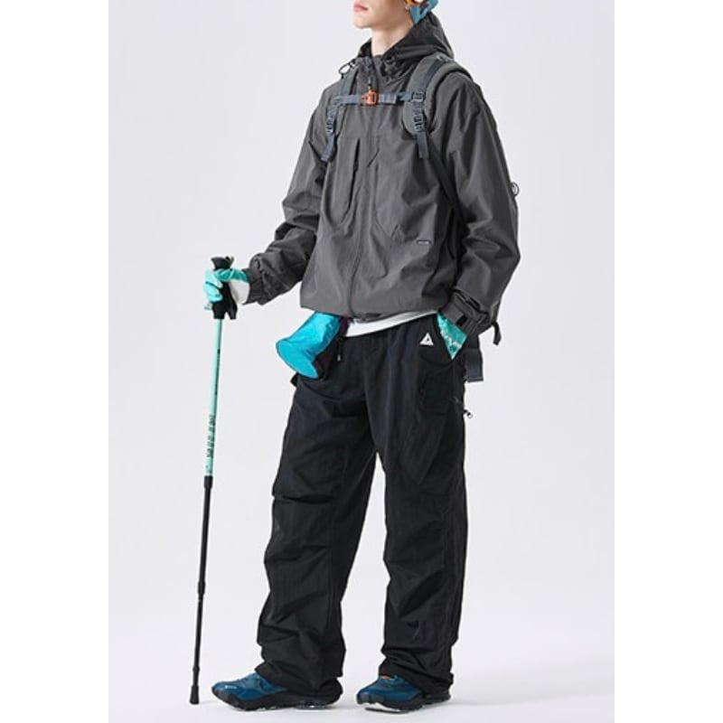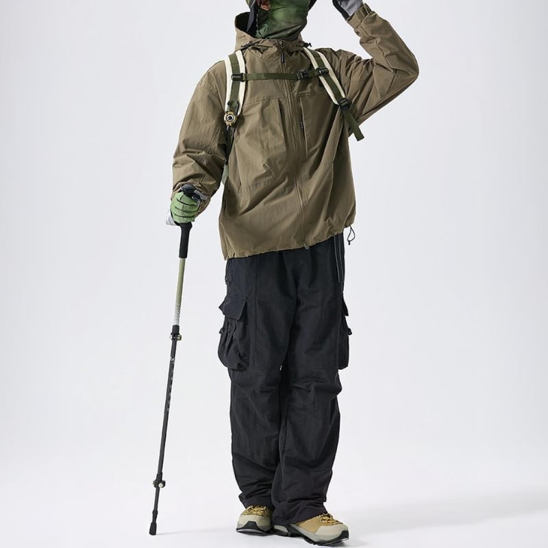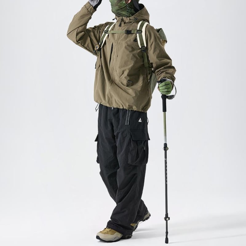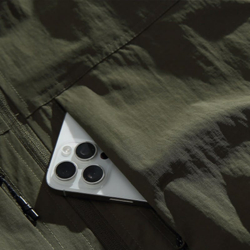 カーブ切替デザインと止水風ジップポケットがアクセントになり、アウトドアスタイルにも馴染みます。