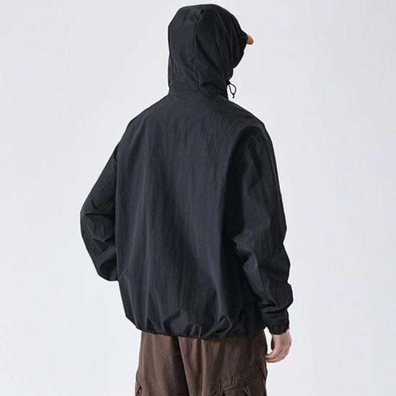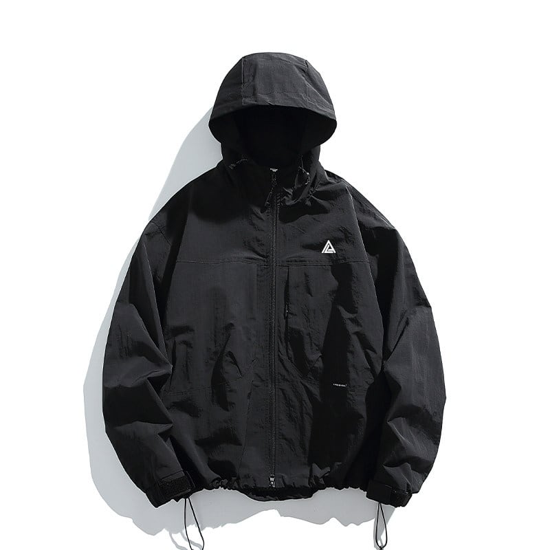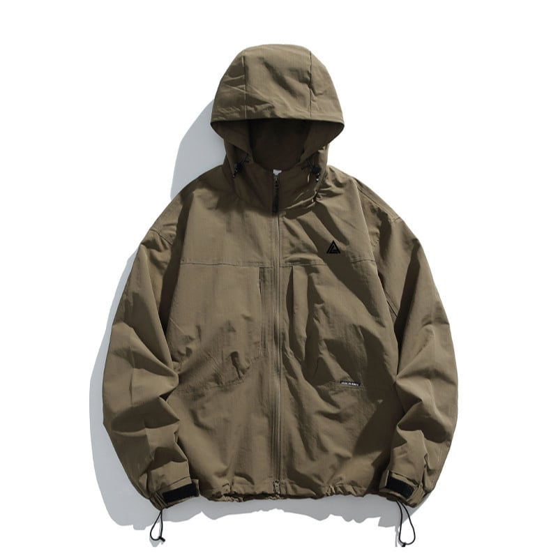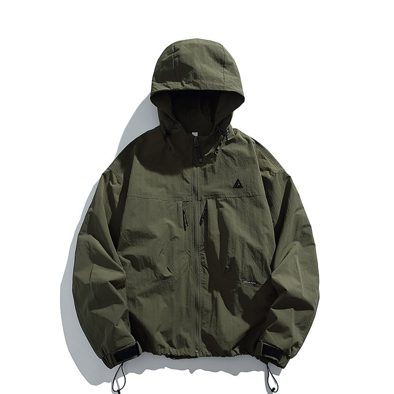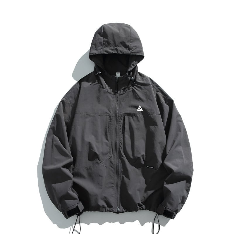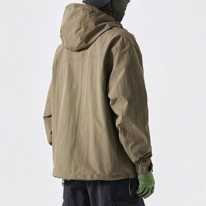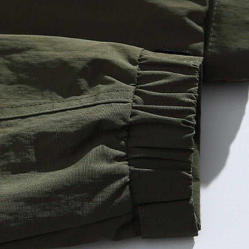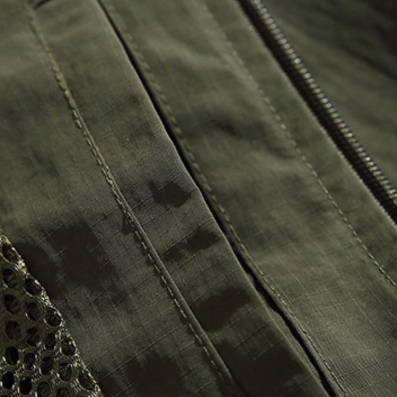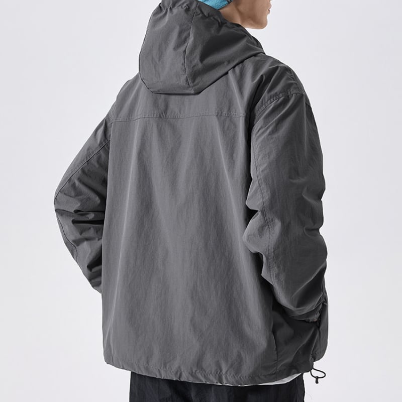 カーブ切替デザインと止水風ジップポケットがアクセントになり、アウトドアスタイルにも馴染みます。