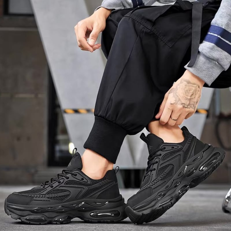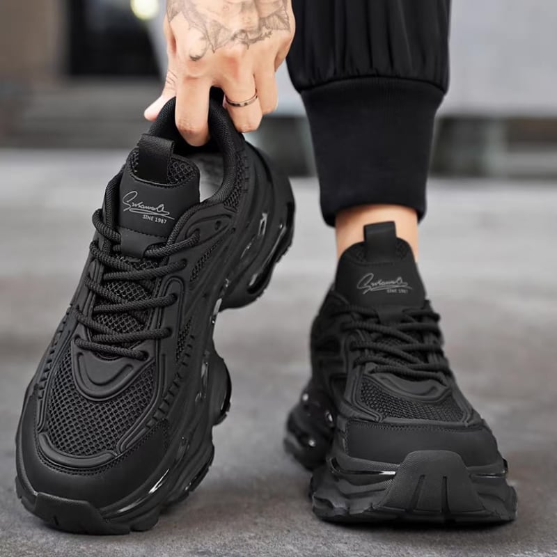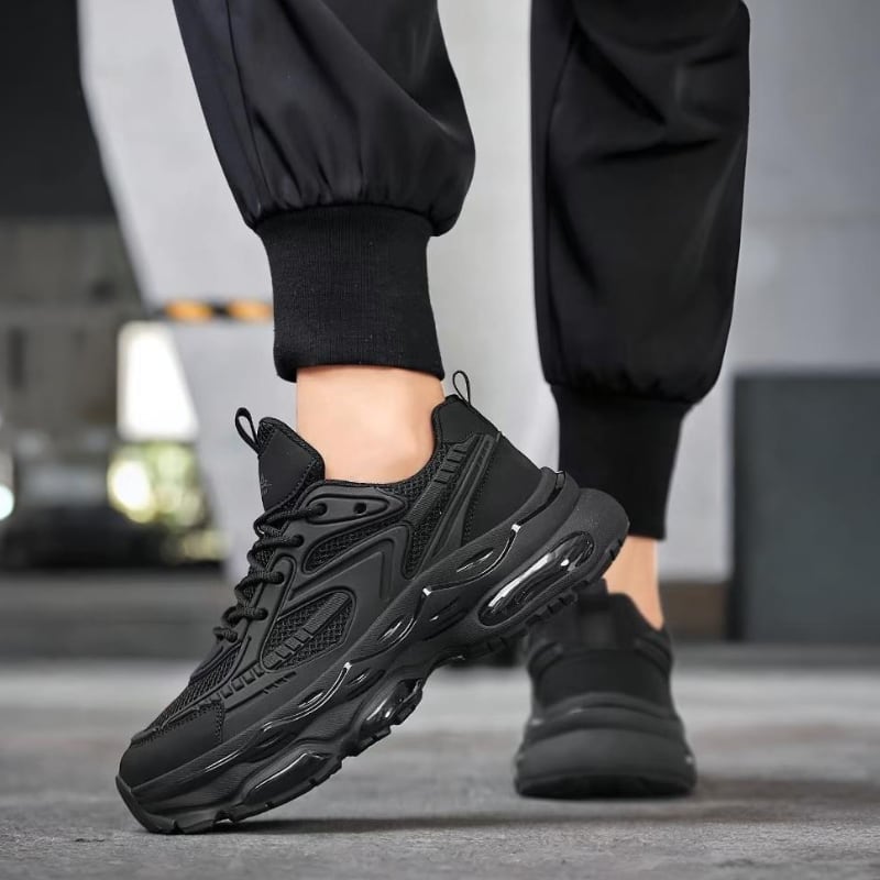 厚みのあるエアクッションソールが足元に存在感を出し、ブラックで統一したデザインがスタイリングを引き締めます。