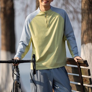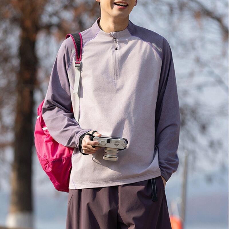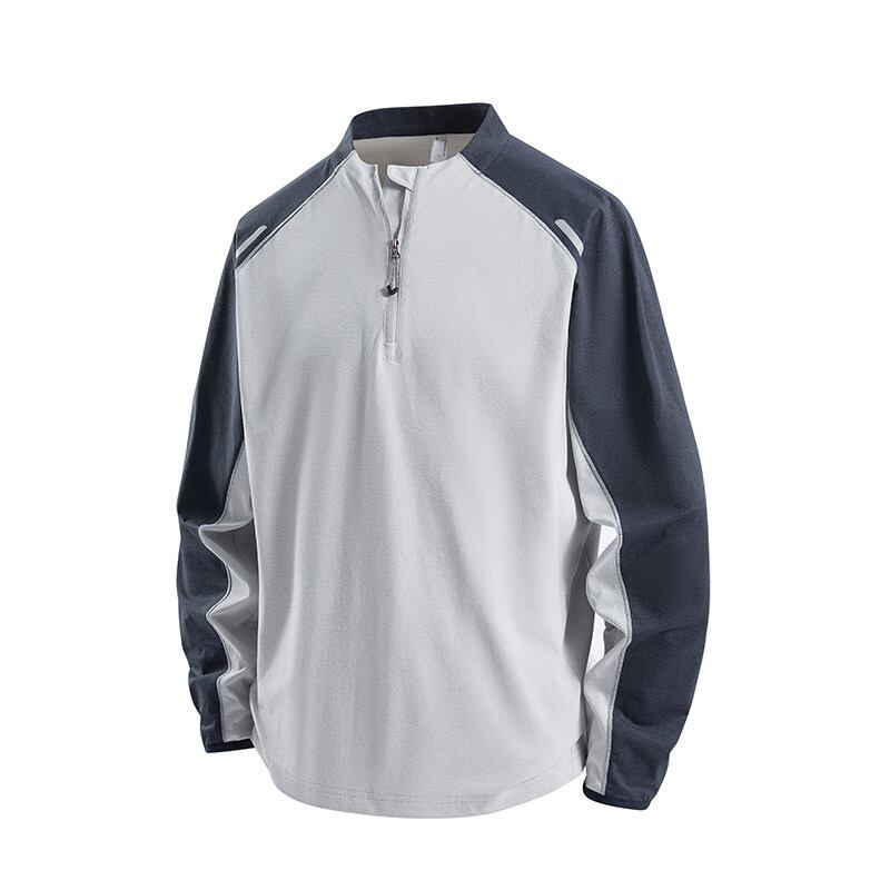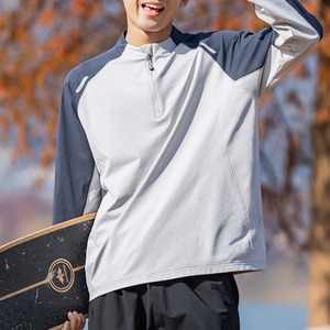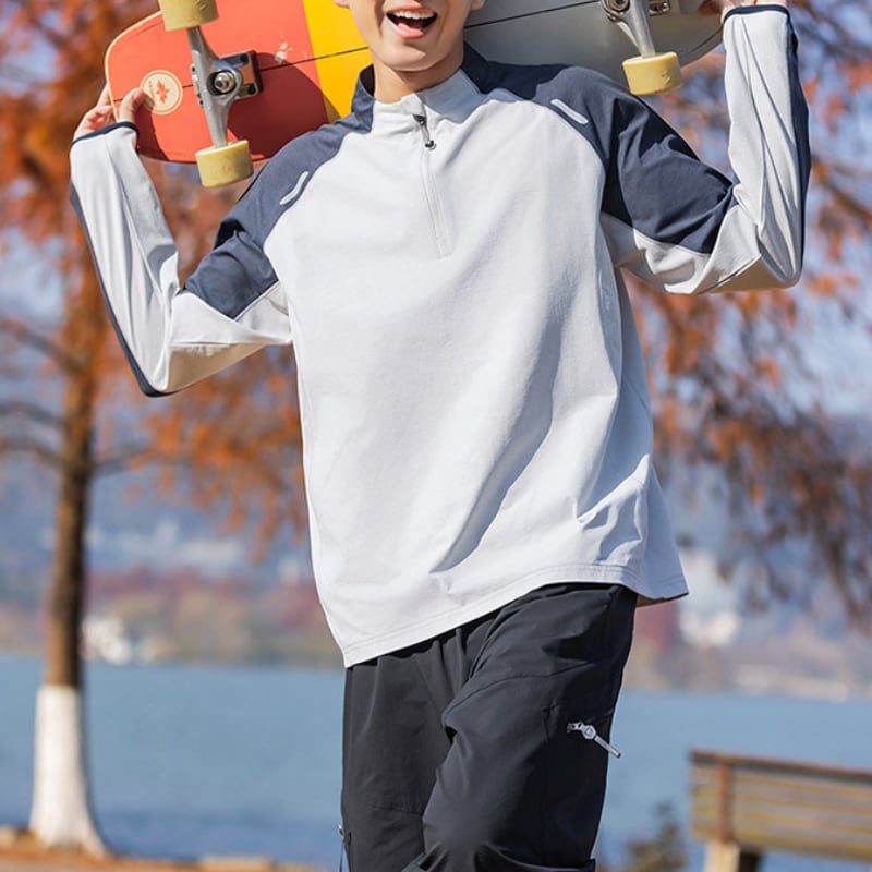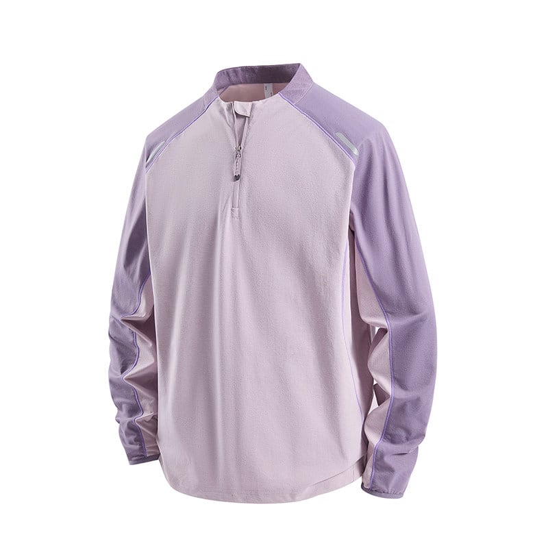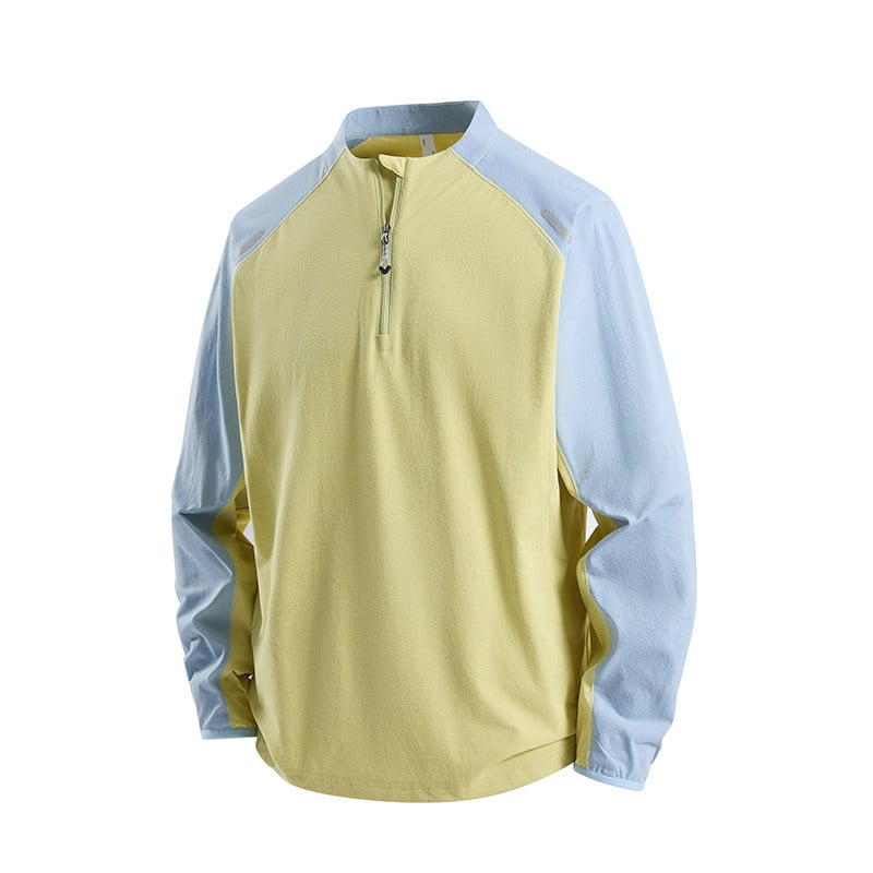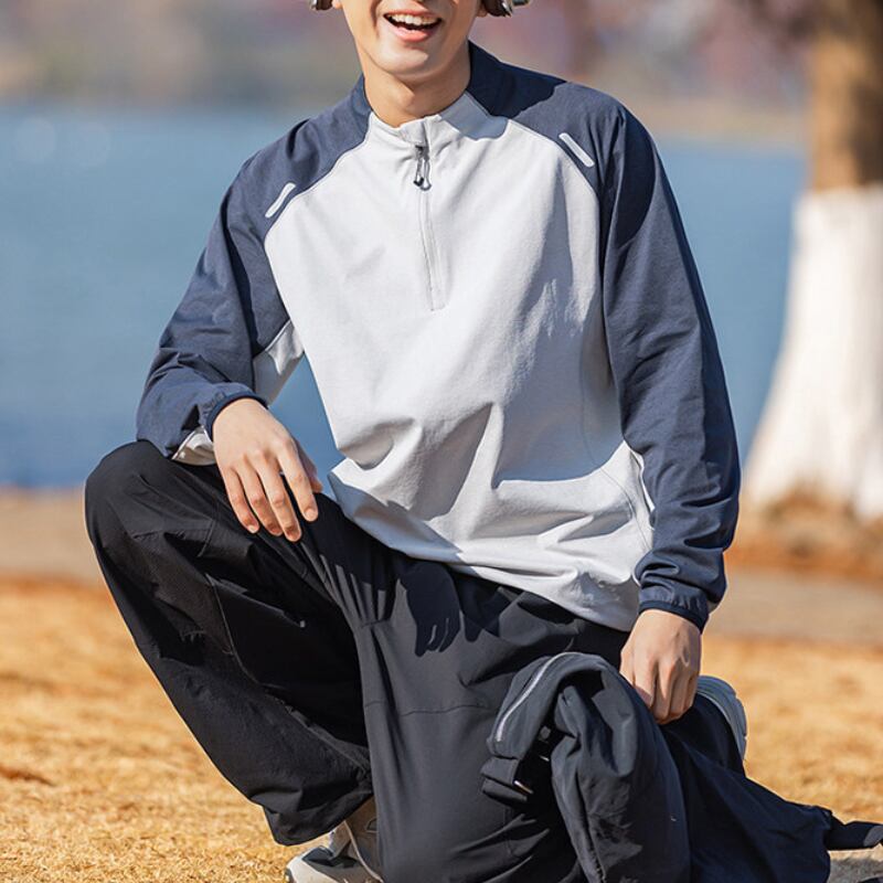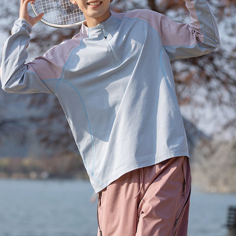 スタンドカラーにハーフジップを合わせた、スポーティーな印象のカラーブロックプルオーバー。