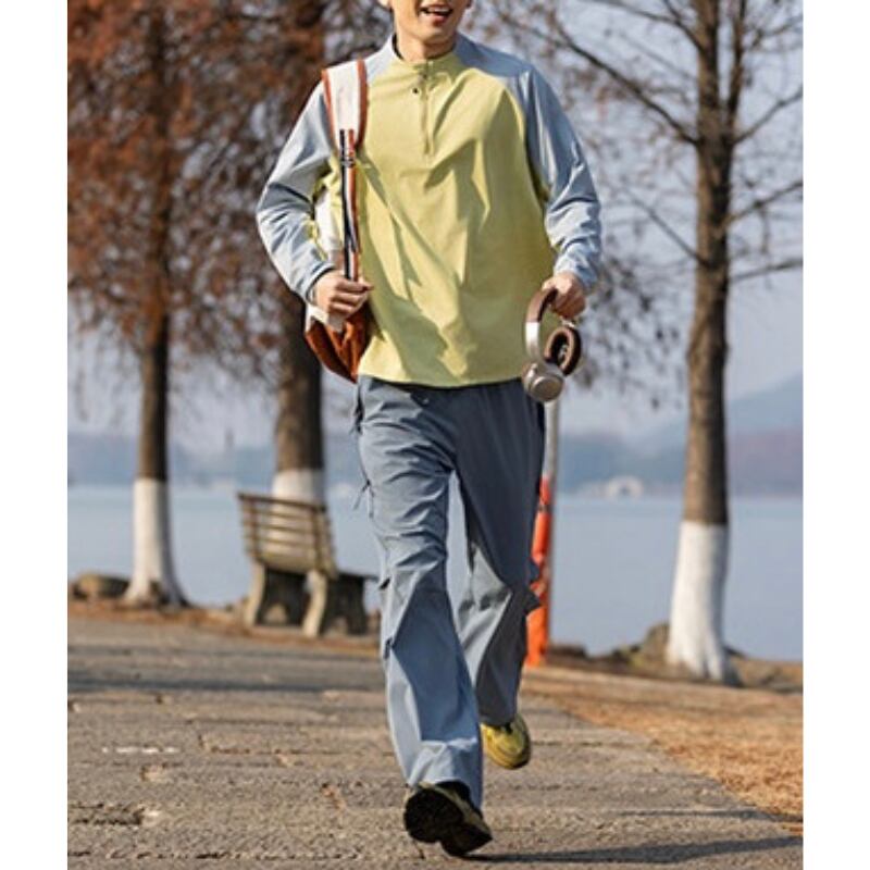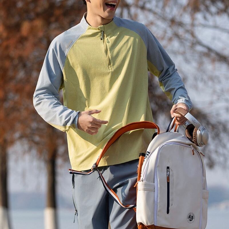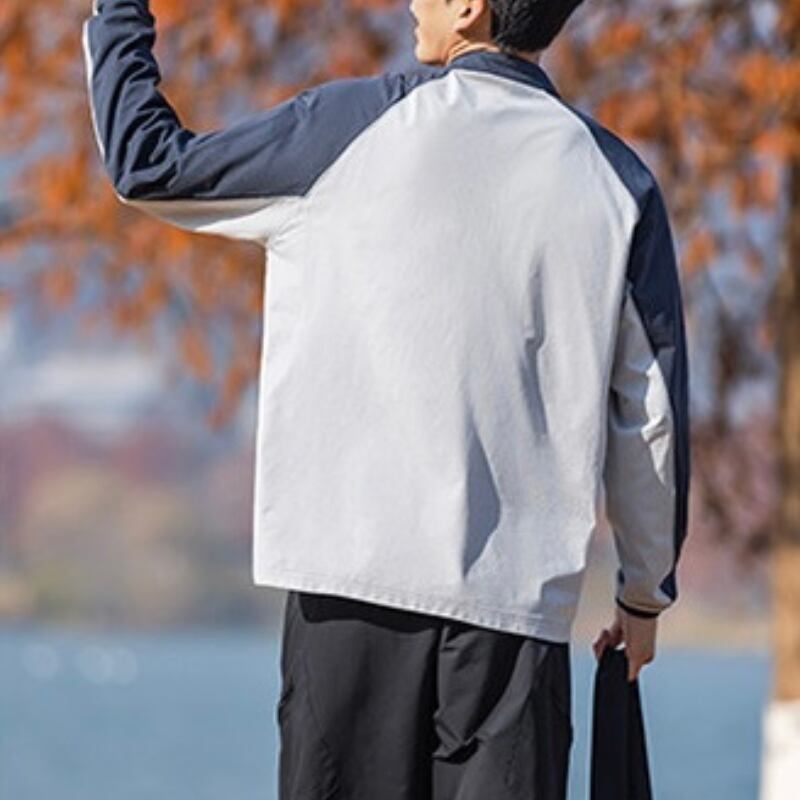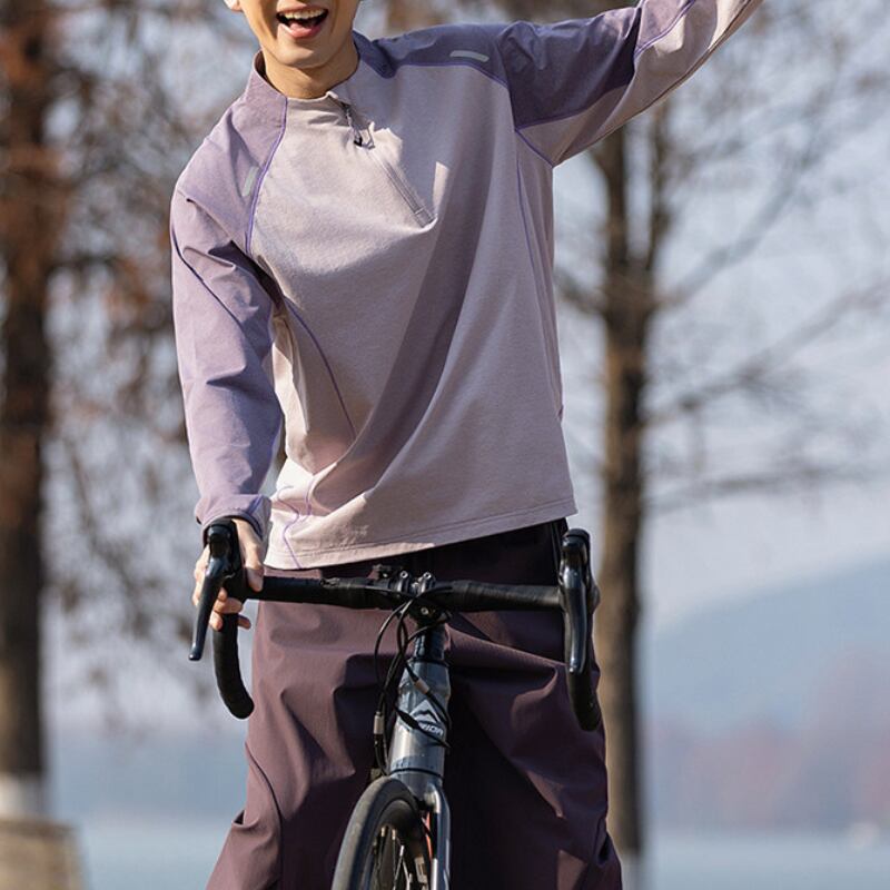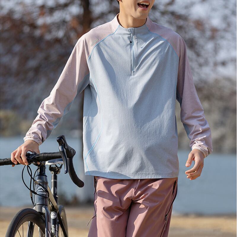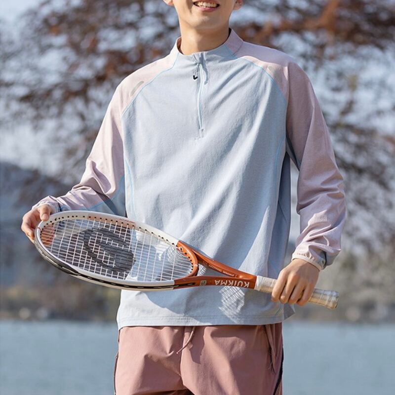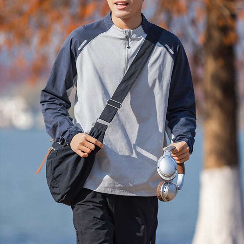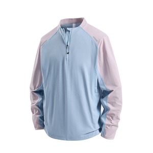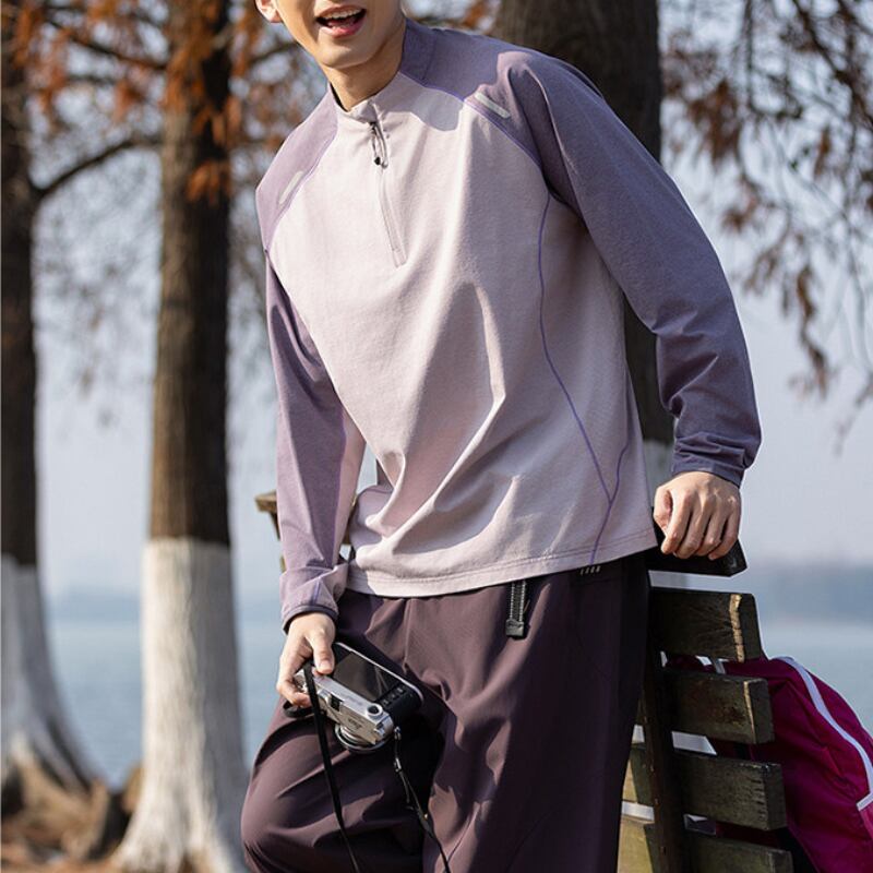 スタンドカラーにハーフジップを合わせた、スポーティーな印象のカラーブロックプルオーバー。