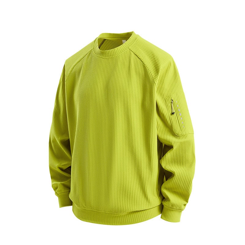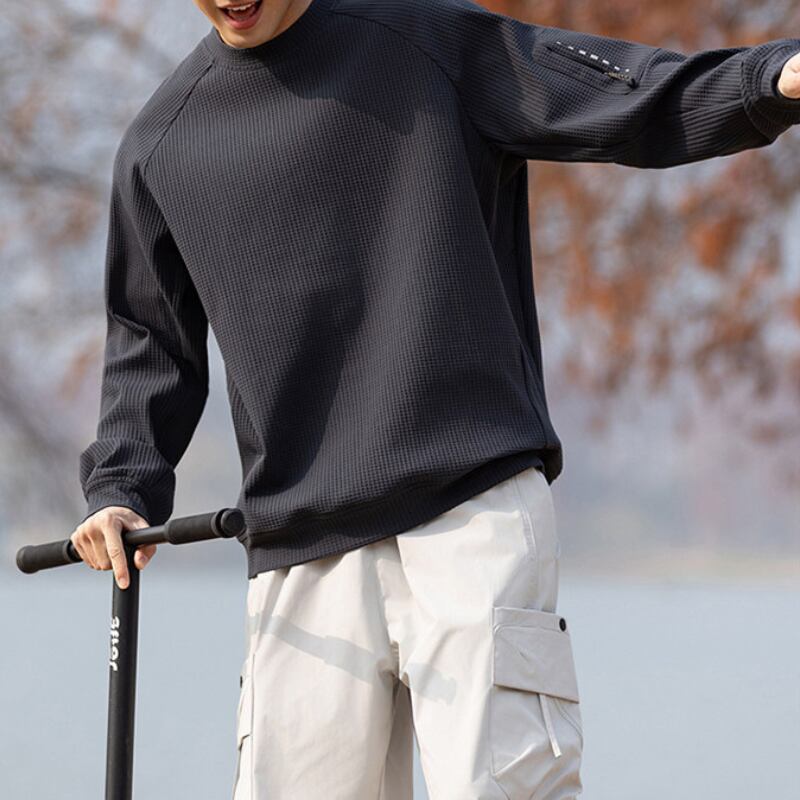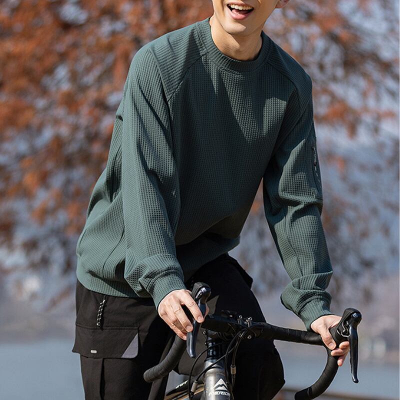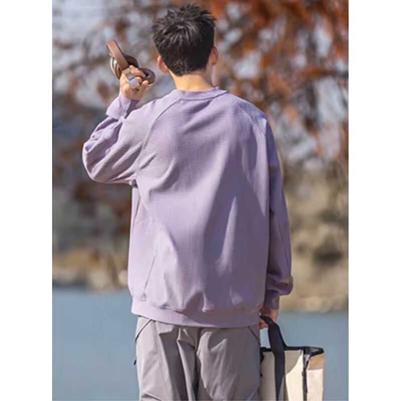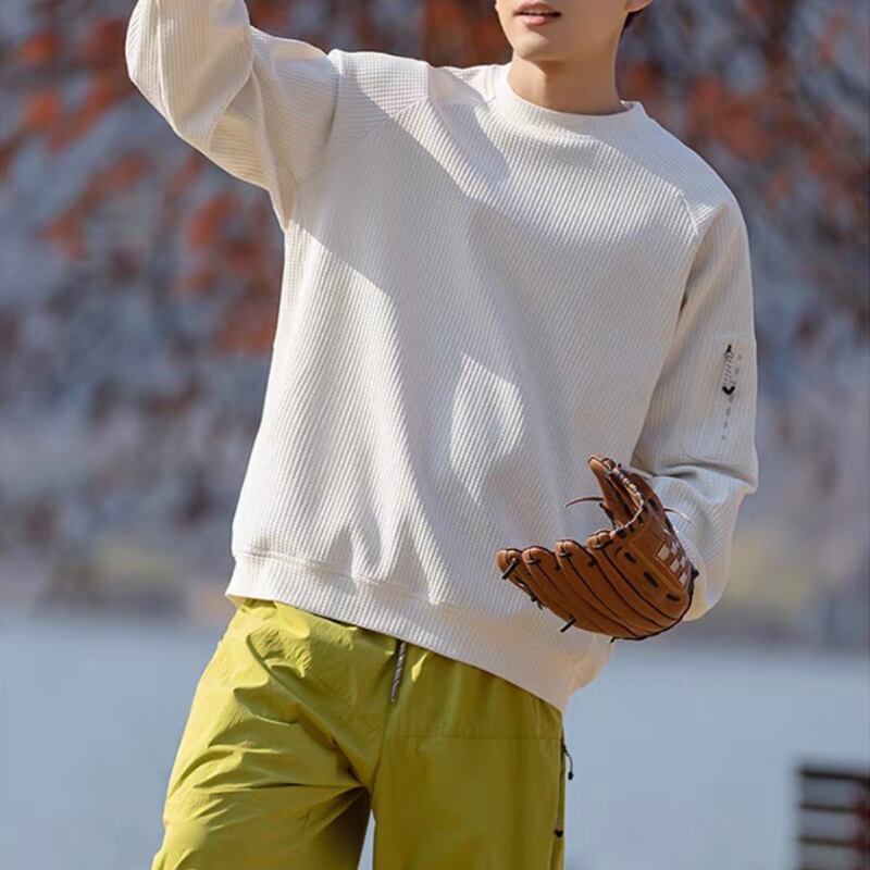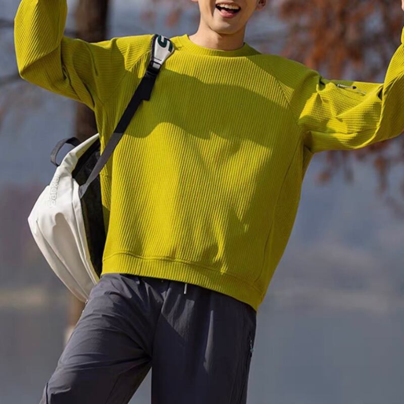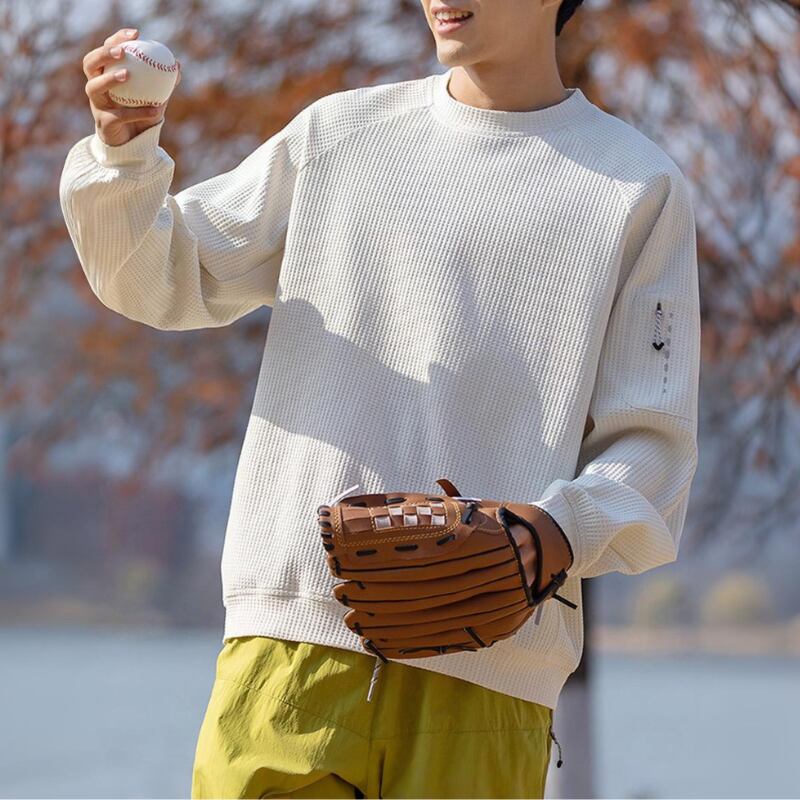ラグラン切り替えとゆったりしたシルエットで、アウトドアやスポーツシーンにも取り入れやすいデザイン。