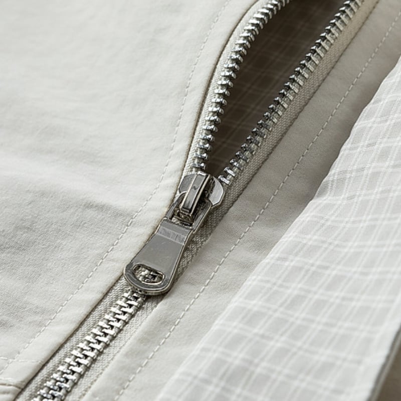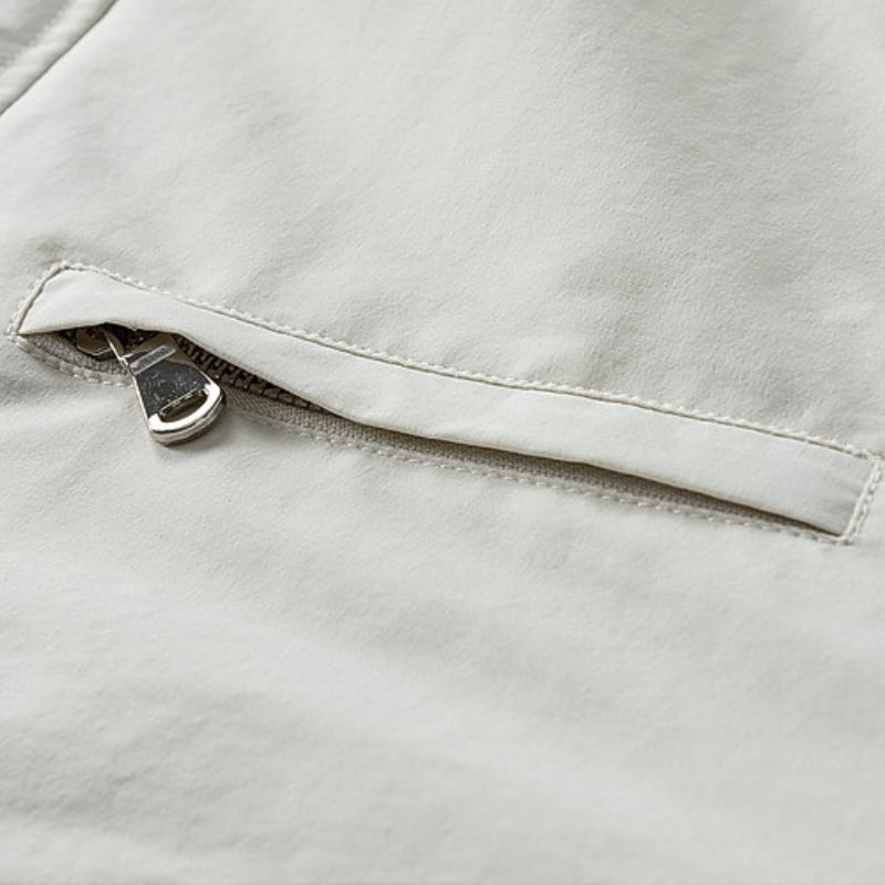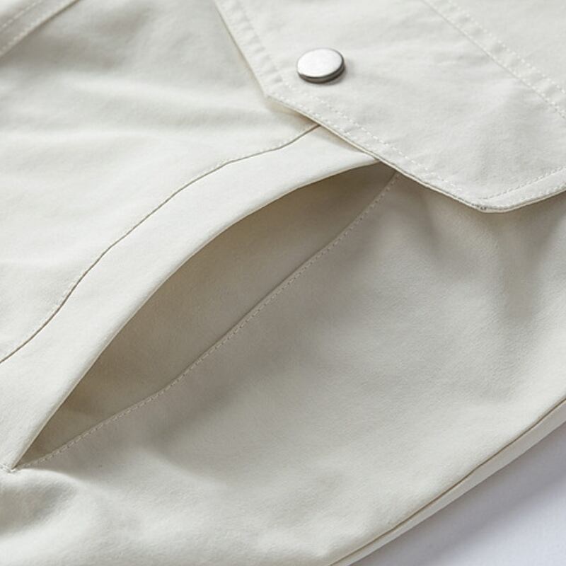 フロントに配置したフラップポケットと胸元のジップポケットが特徴のデザインです。