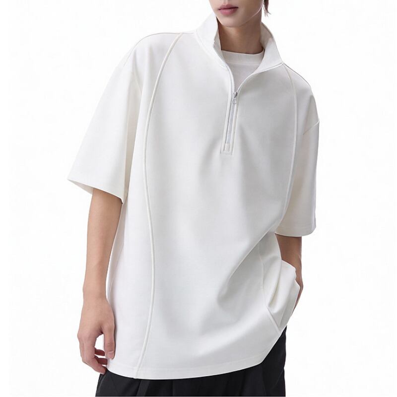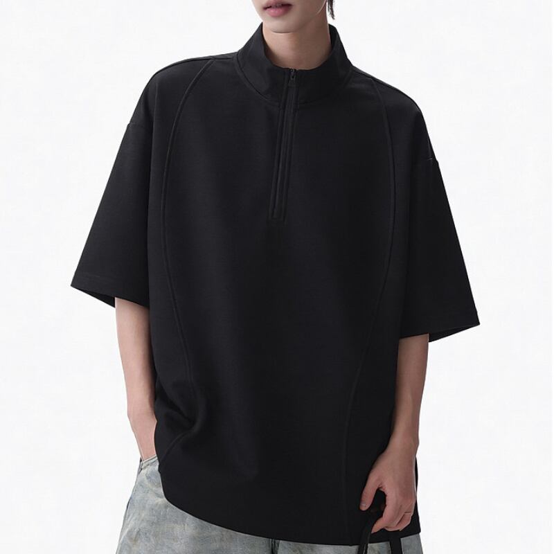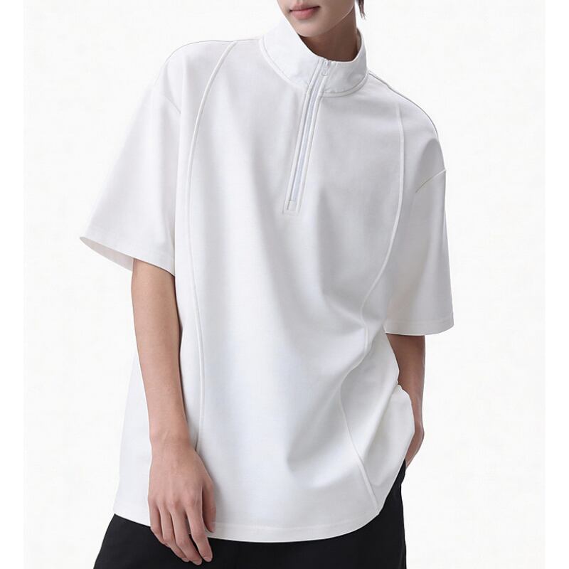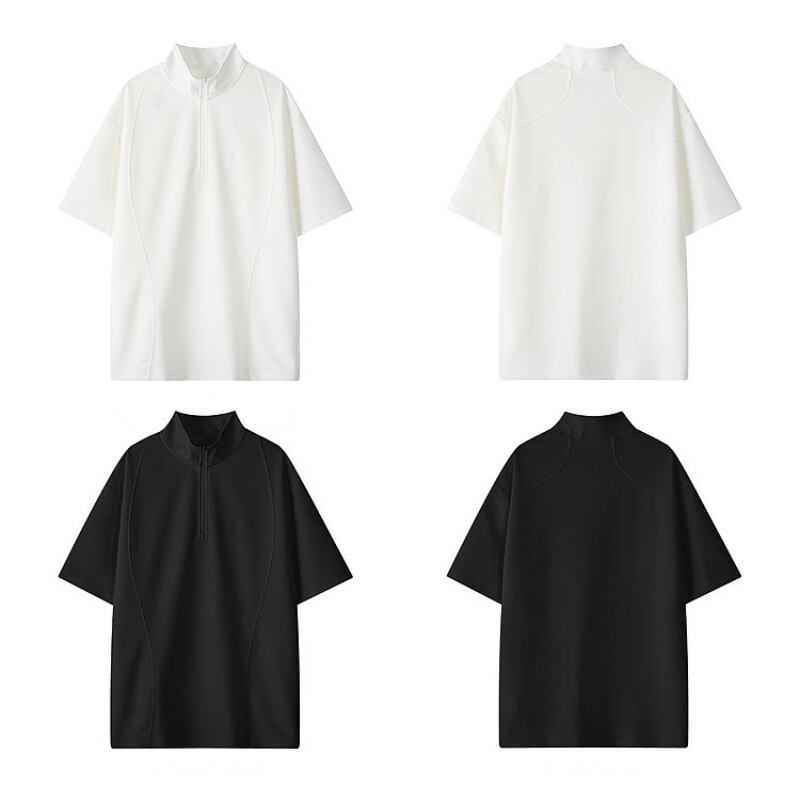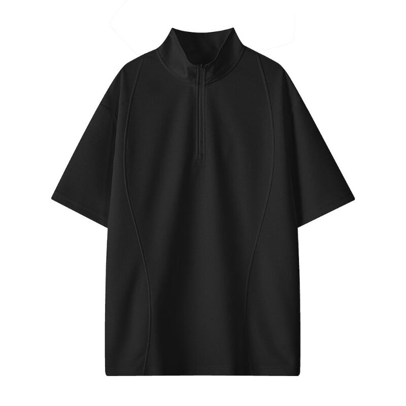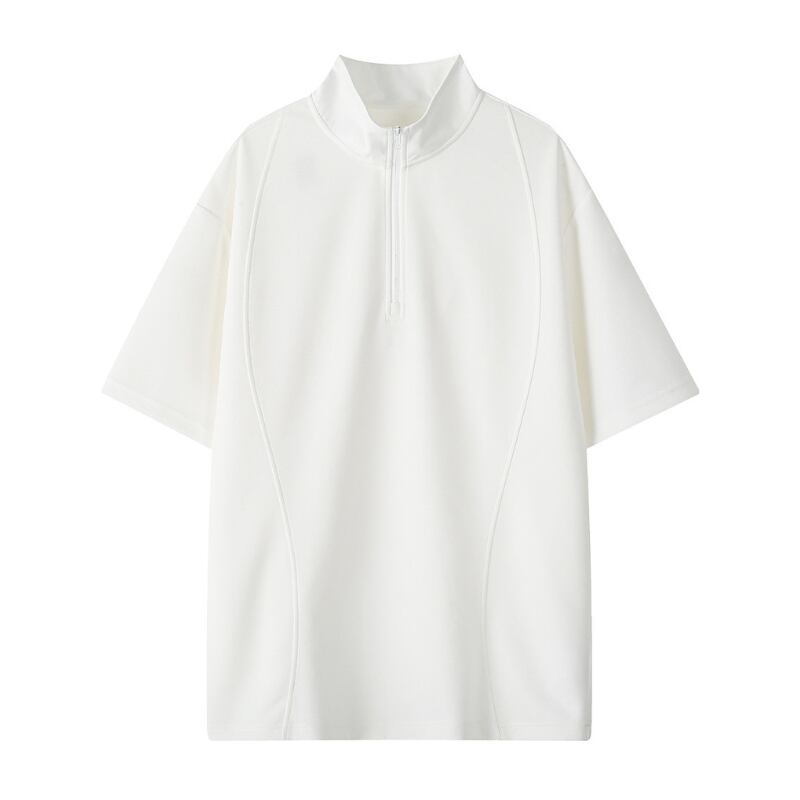 ハイネックとハーフジップデザインが特徴の半袖Tシャツ。