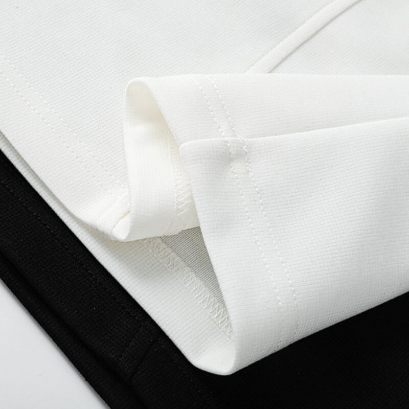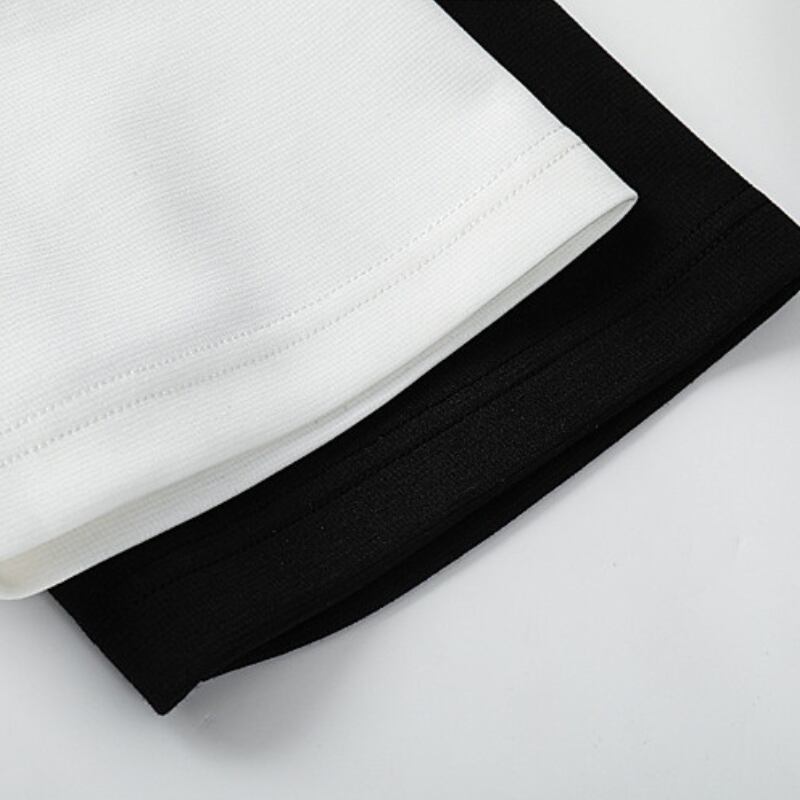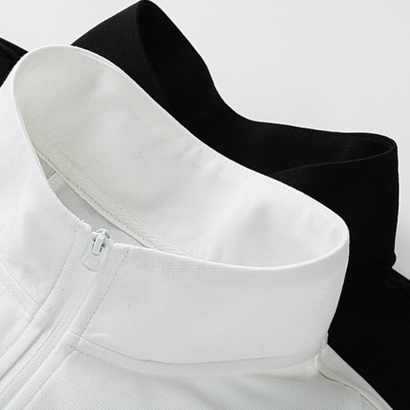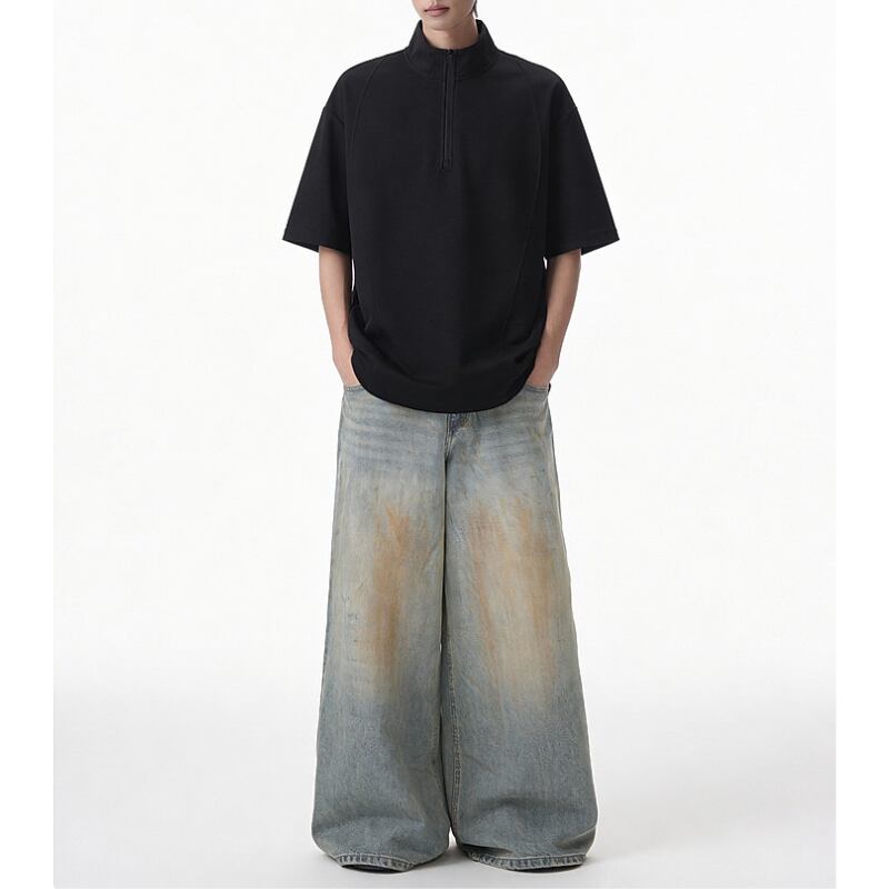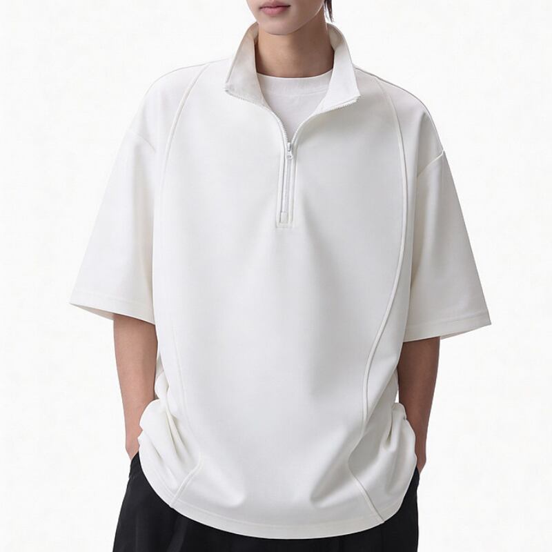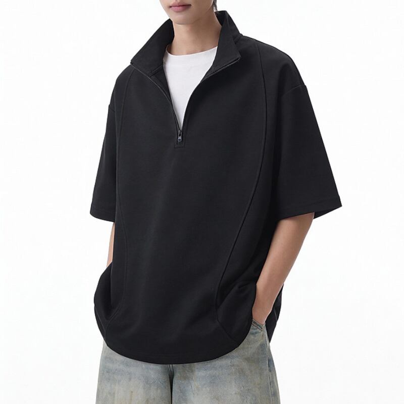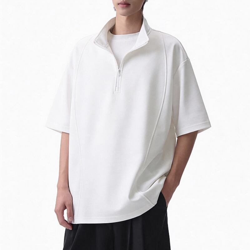 ハイネックとハーフジップデザインが特徴の半袖Tシャツ。