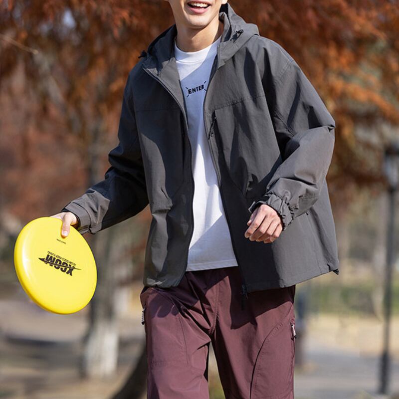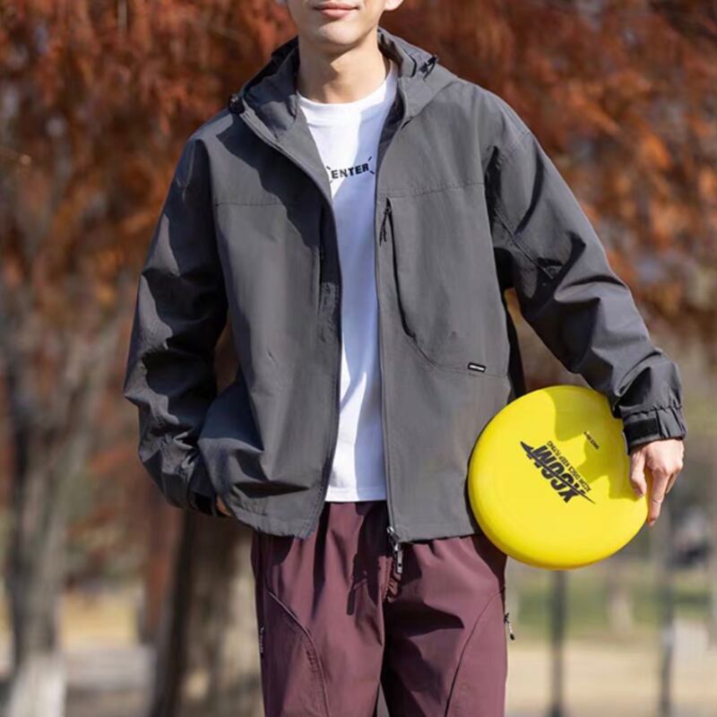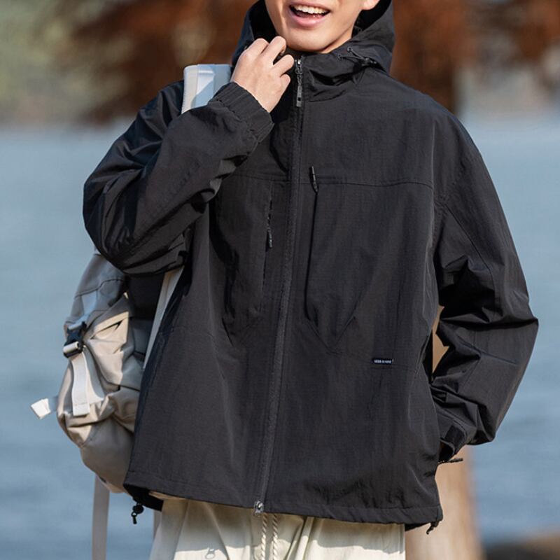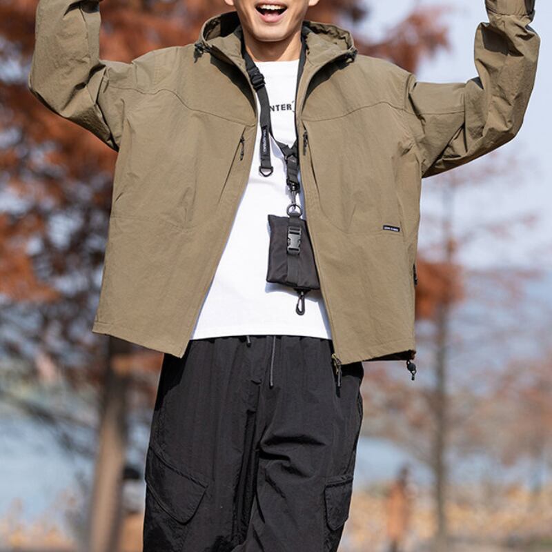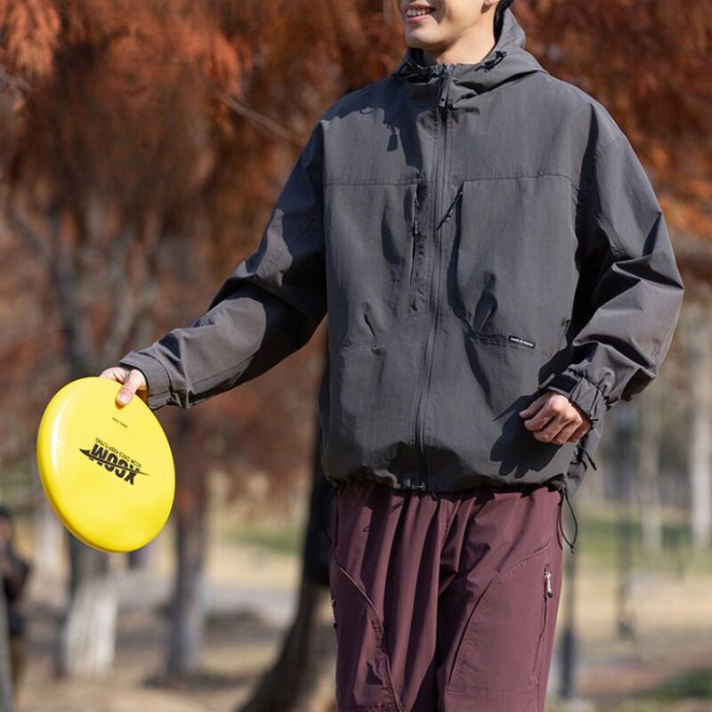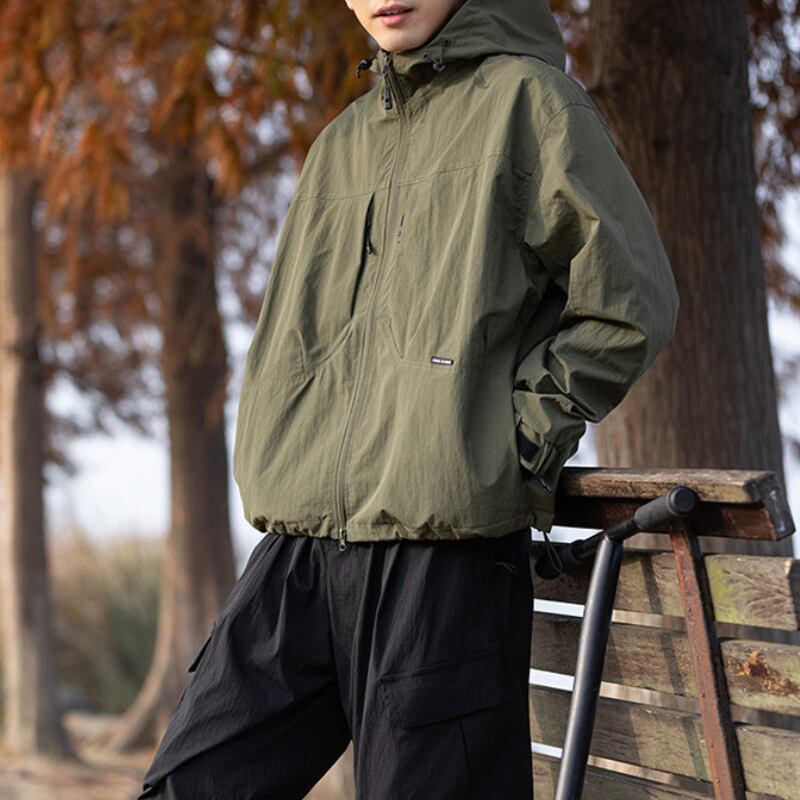 フード付きデザインとフロントジップ仕様が特徴のジャケット。