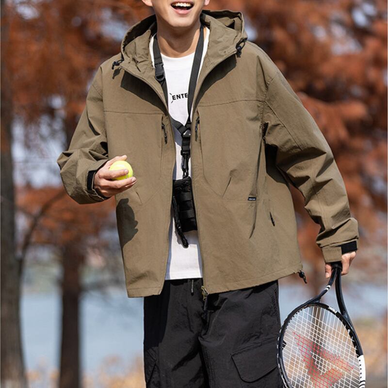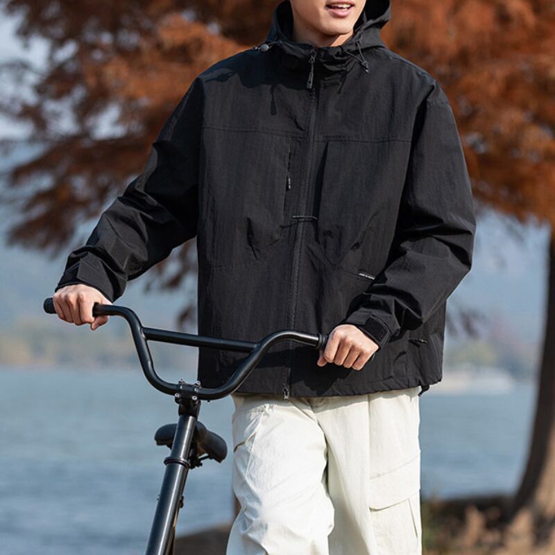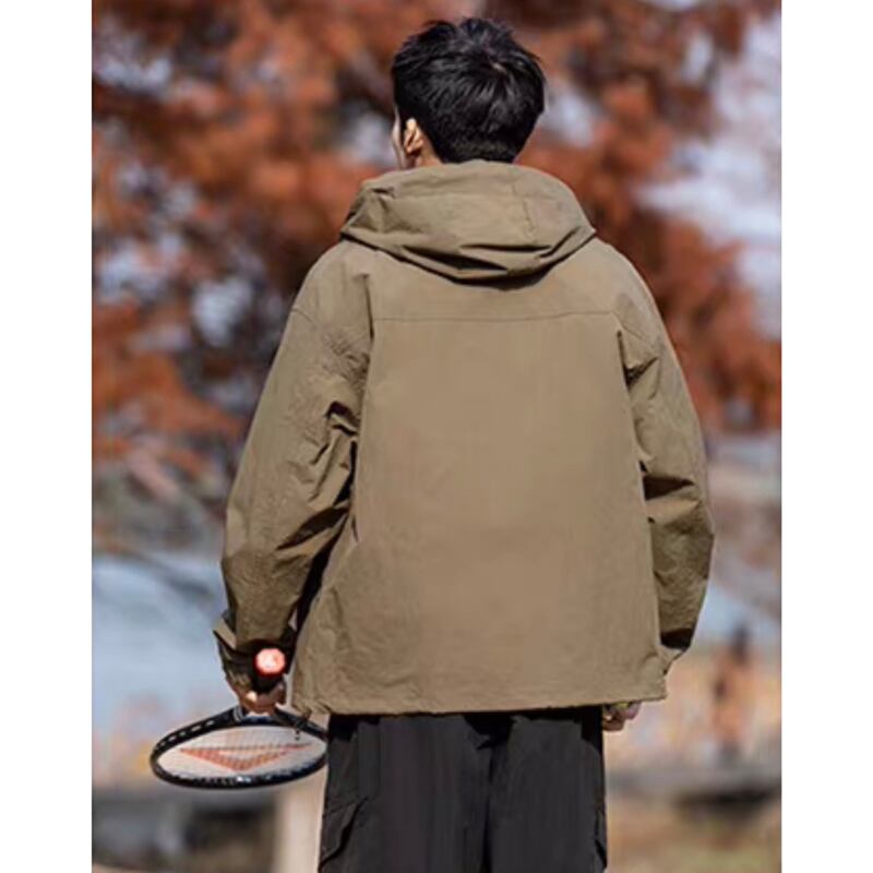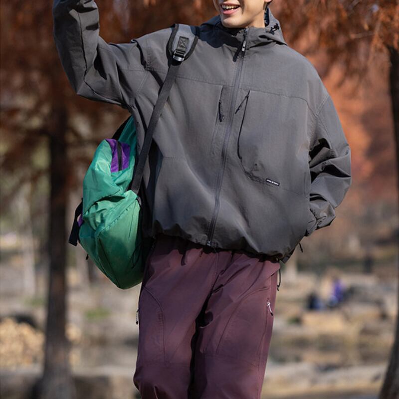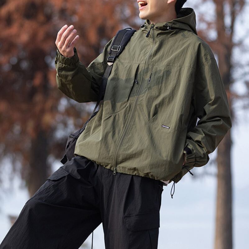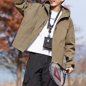 フード付きデザインとフロントジップ仕様が特徴のジャケット。