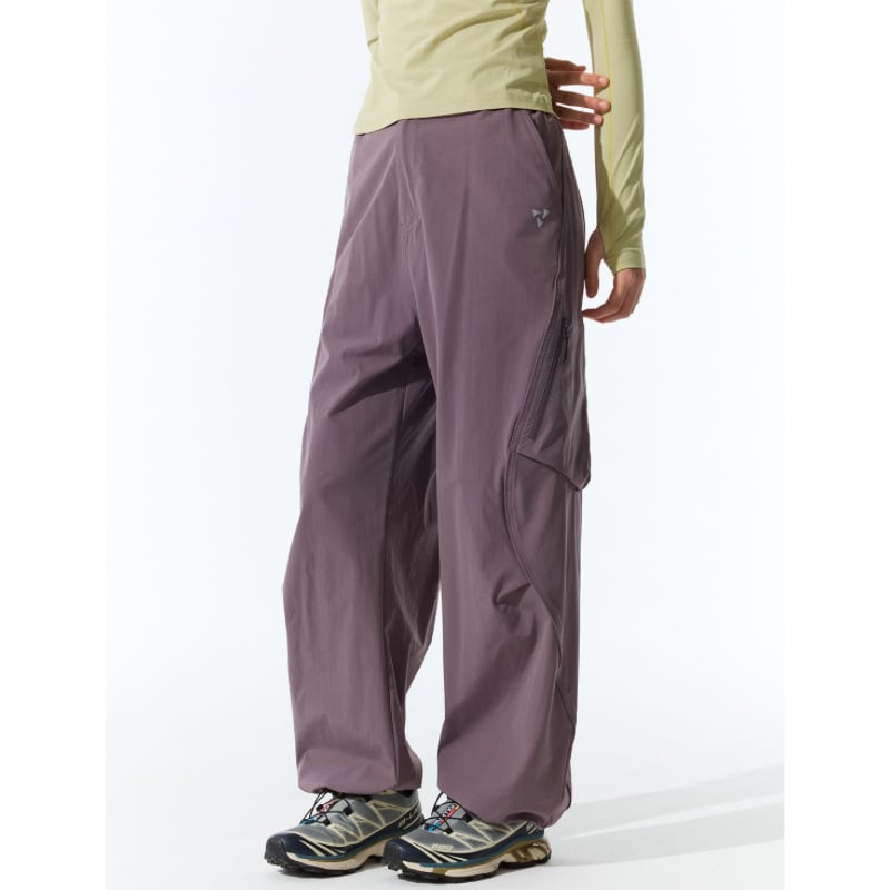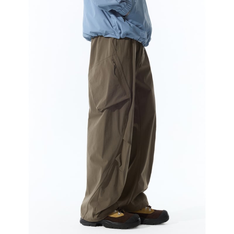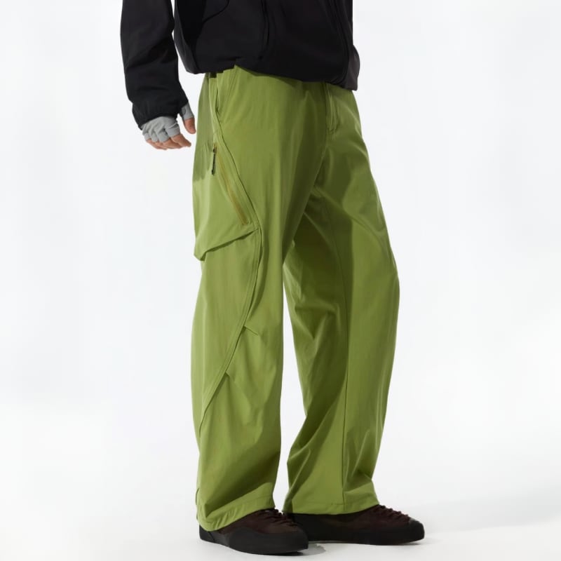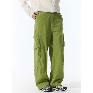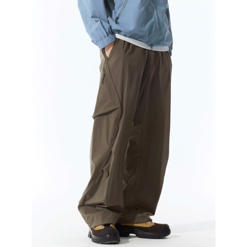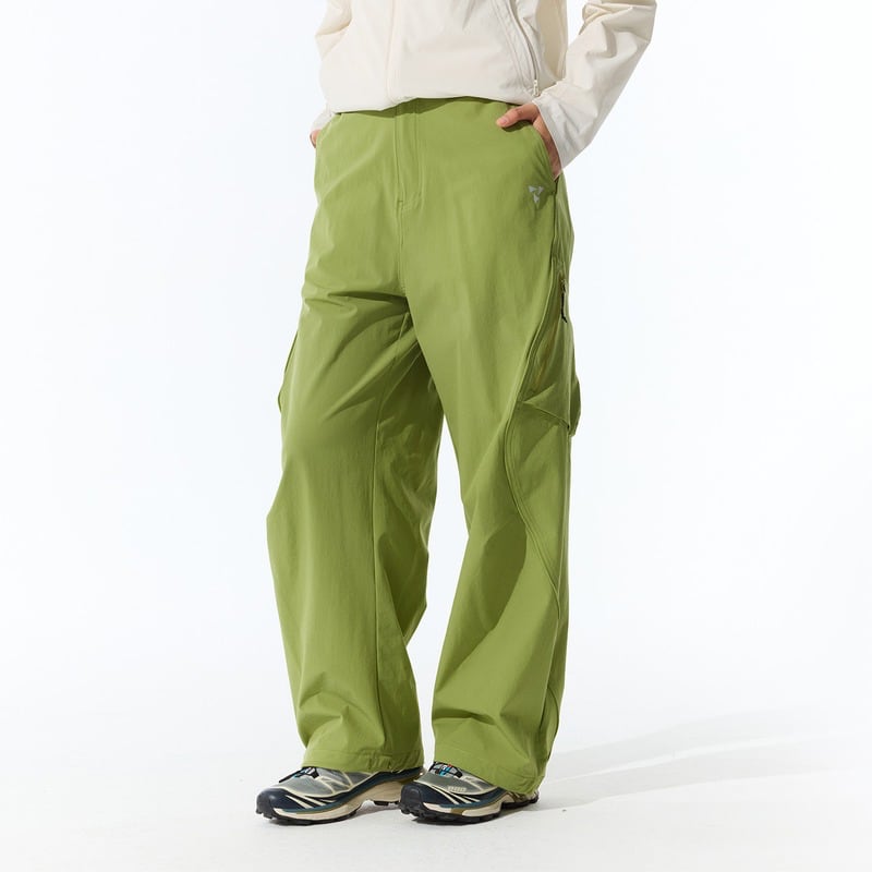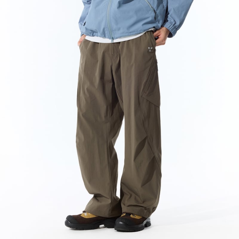 斜めジップポケットと立体カーゴポケットが特徴のパンツ。