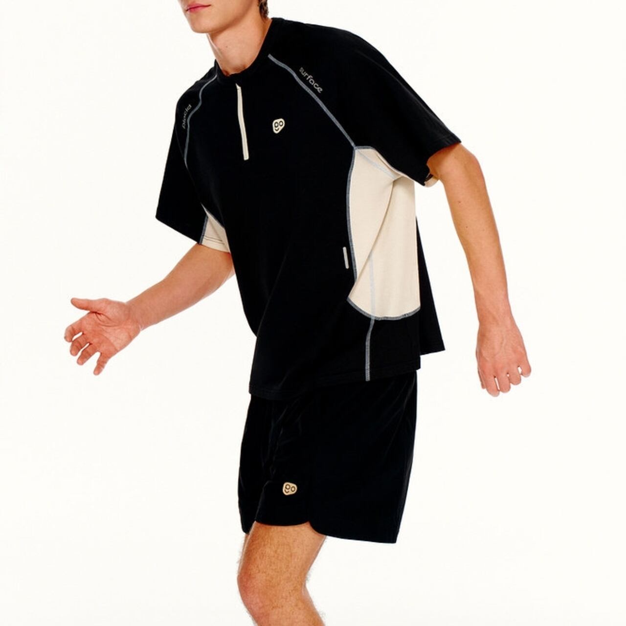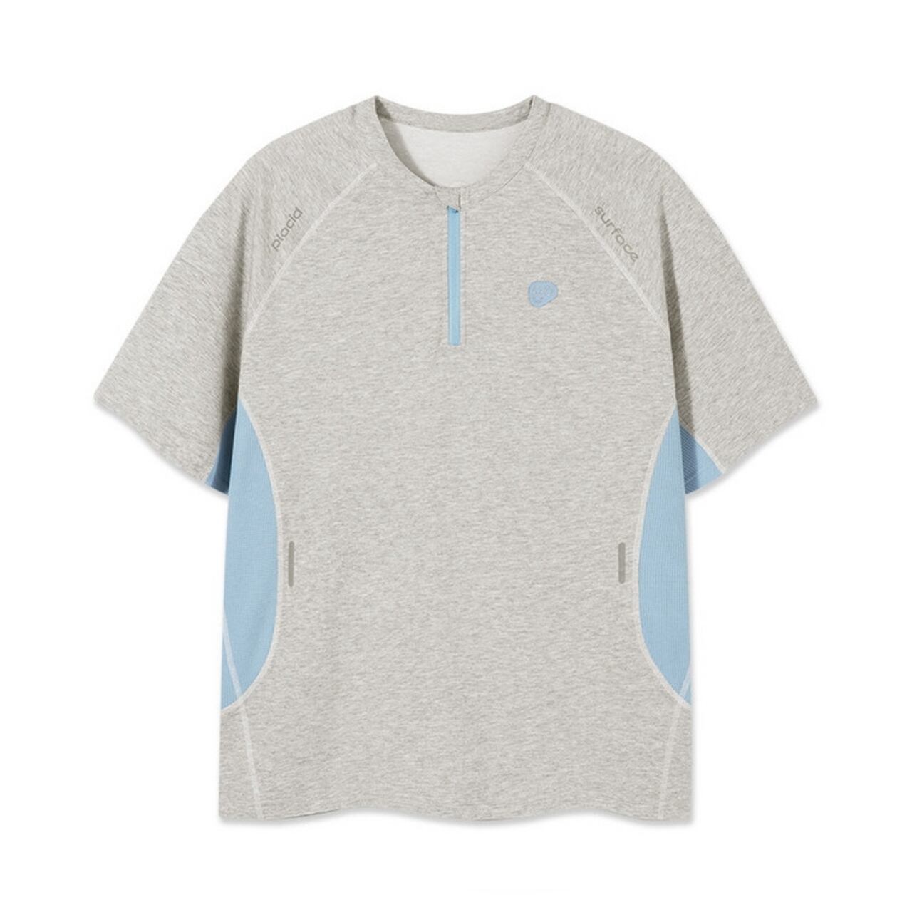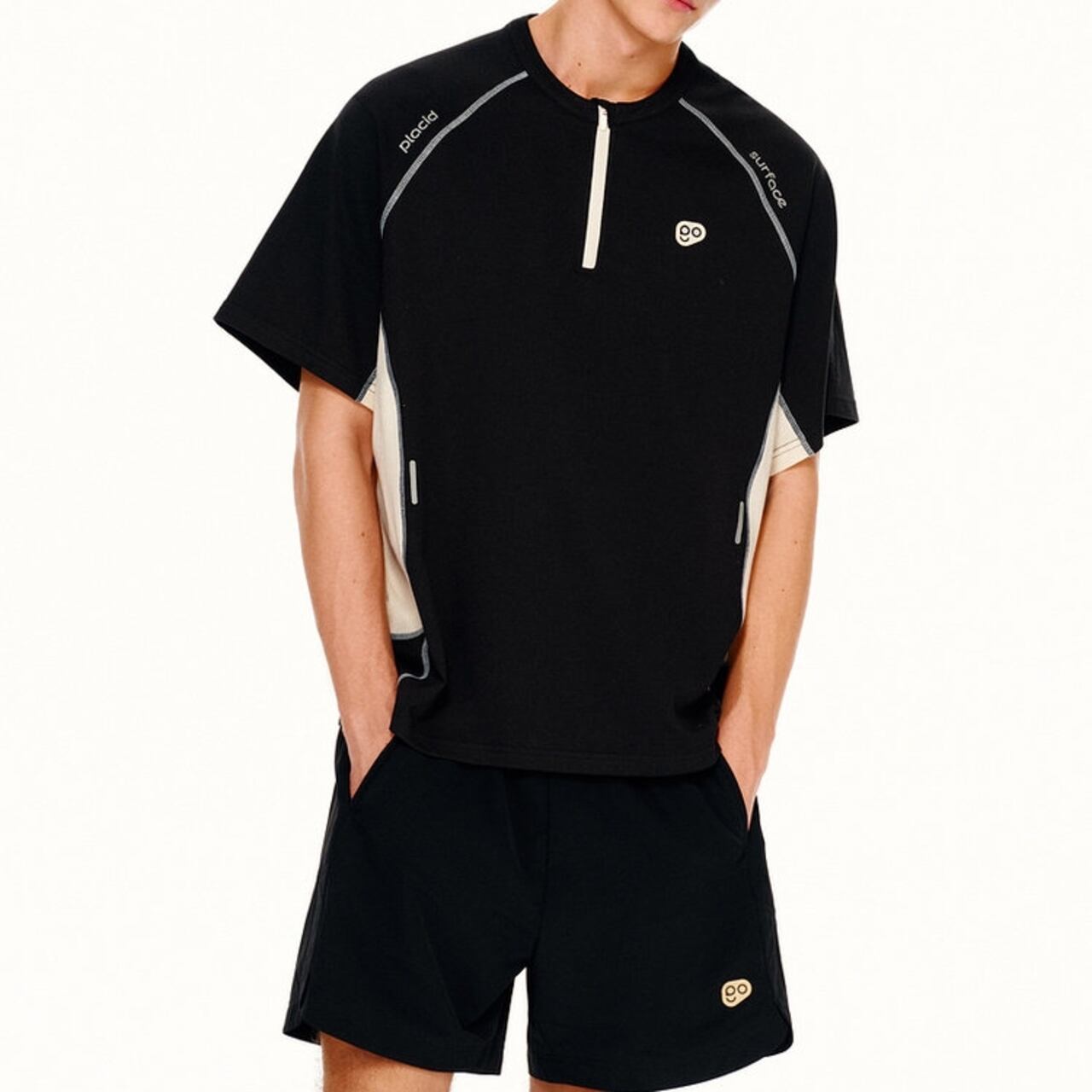 ハーフジップデザインが特徴的なカラーブロッキング半袖トップス。
