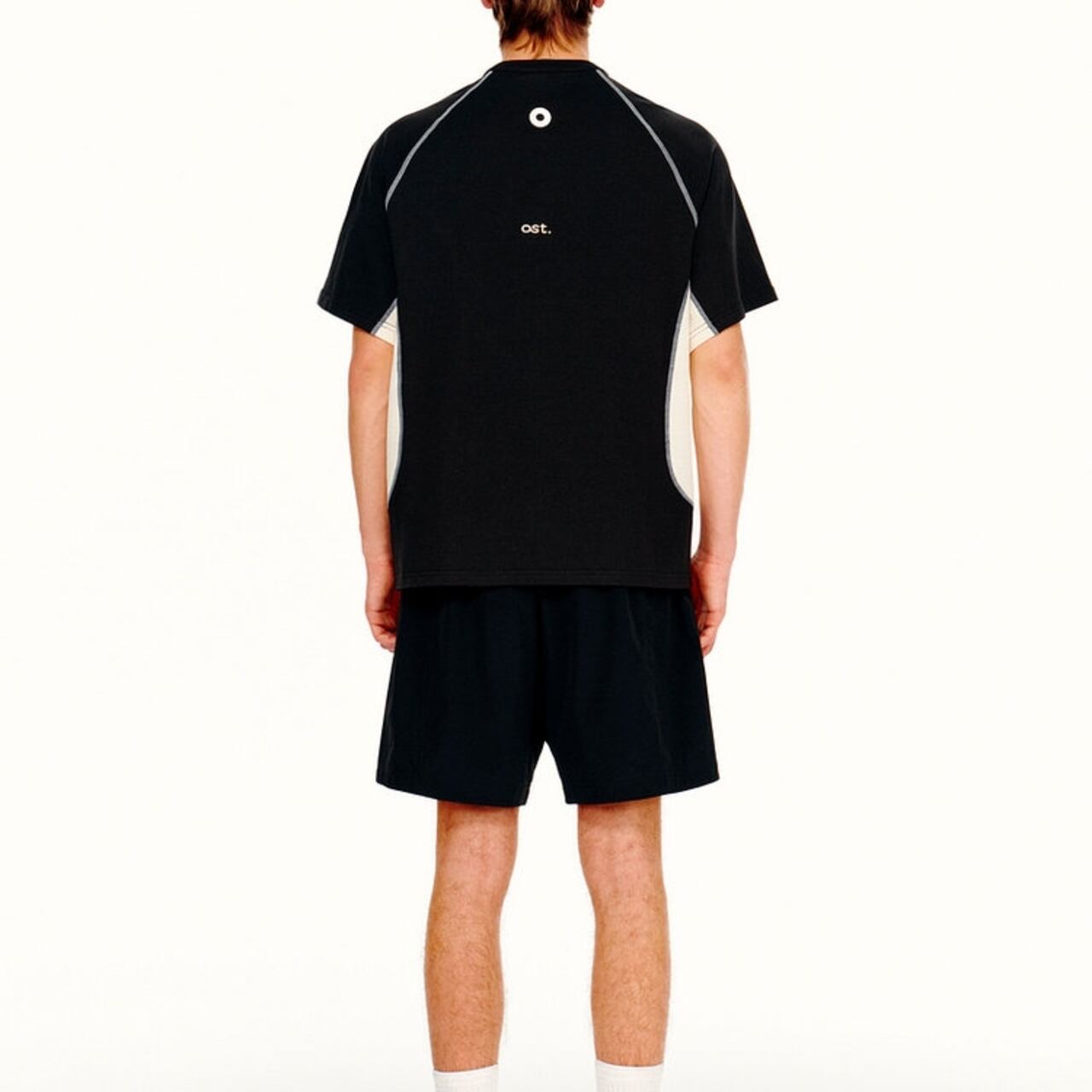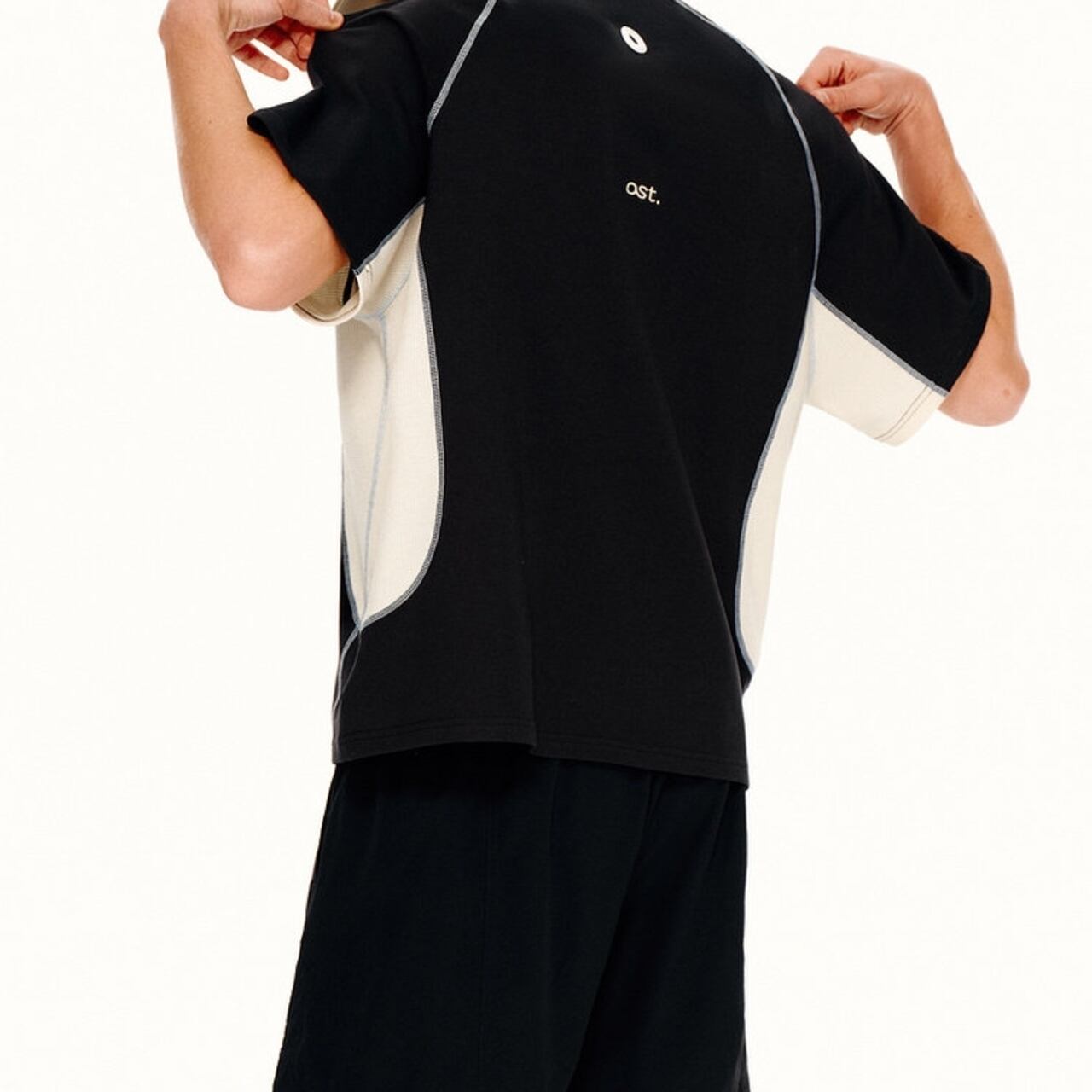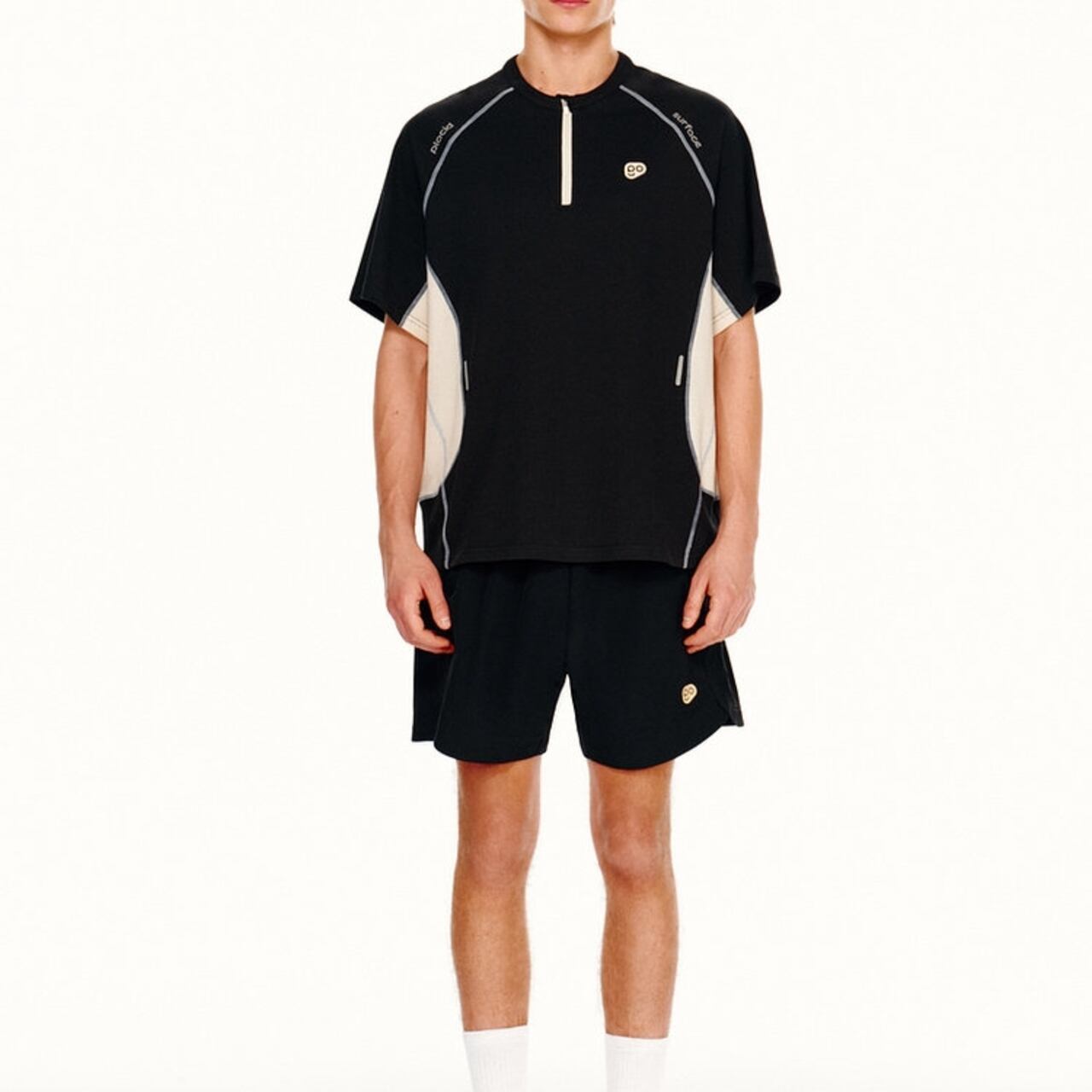 ハーフジップデザインが特徴的なカラーブロッキング半袖トップス。