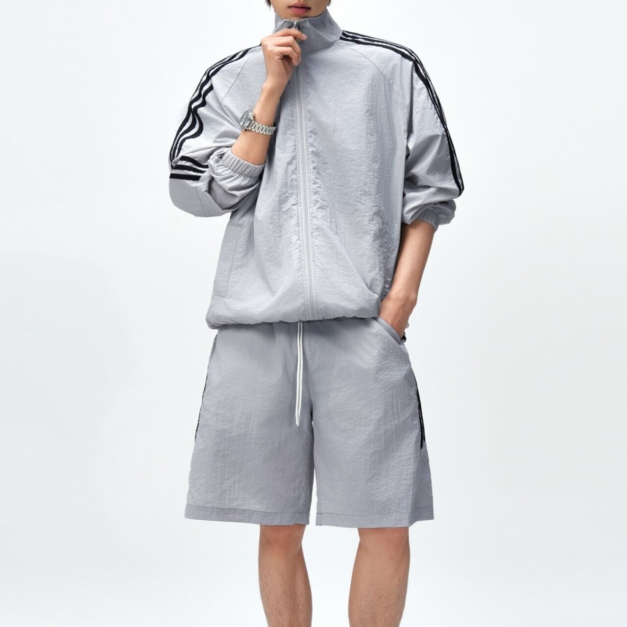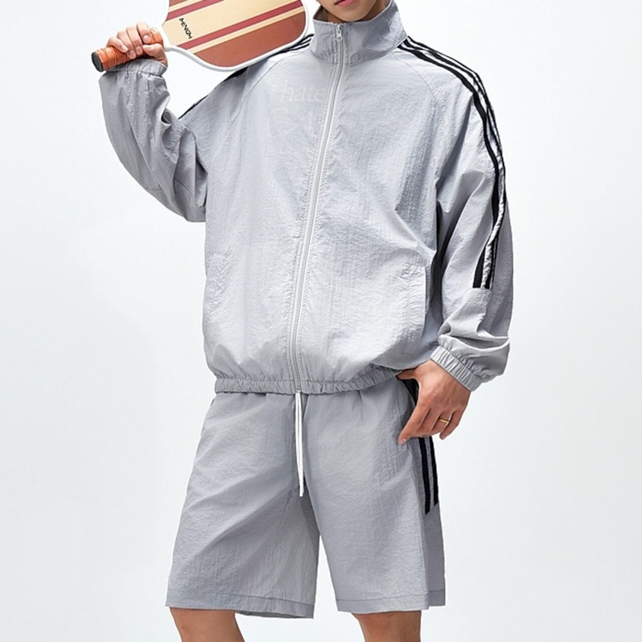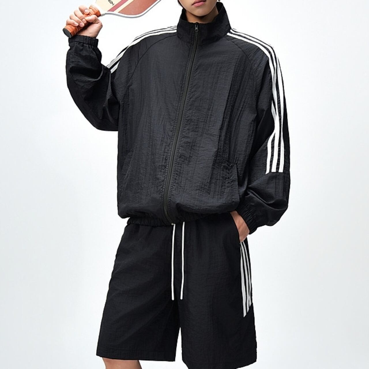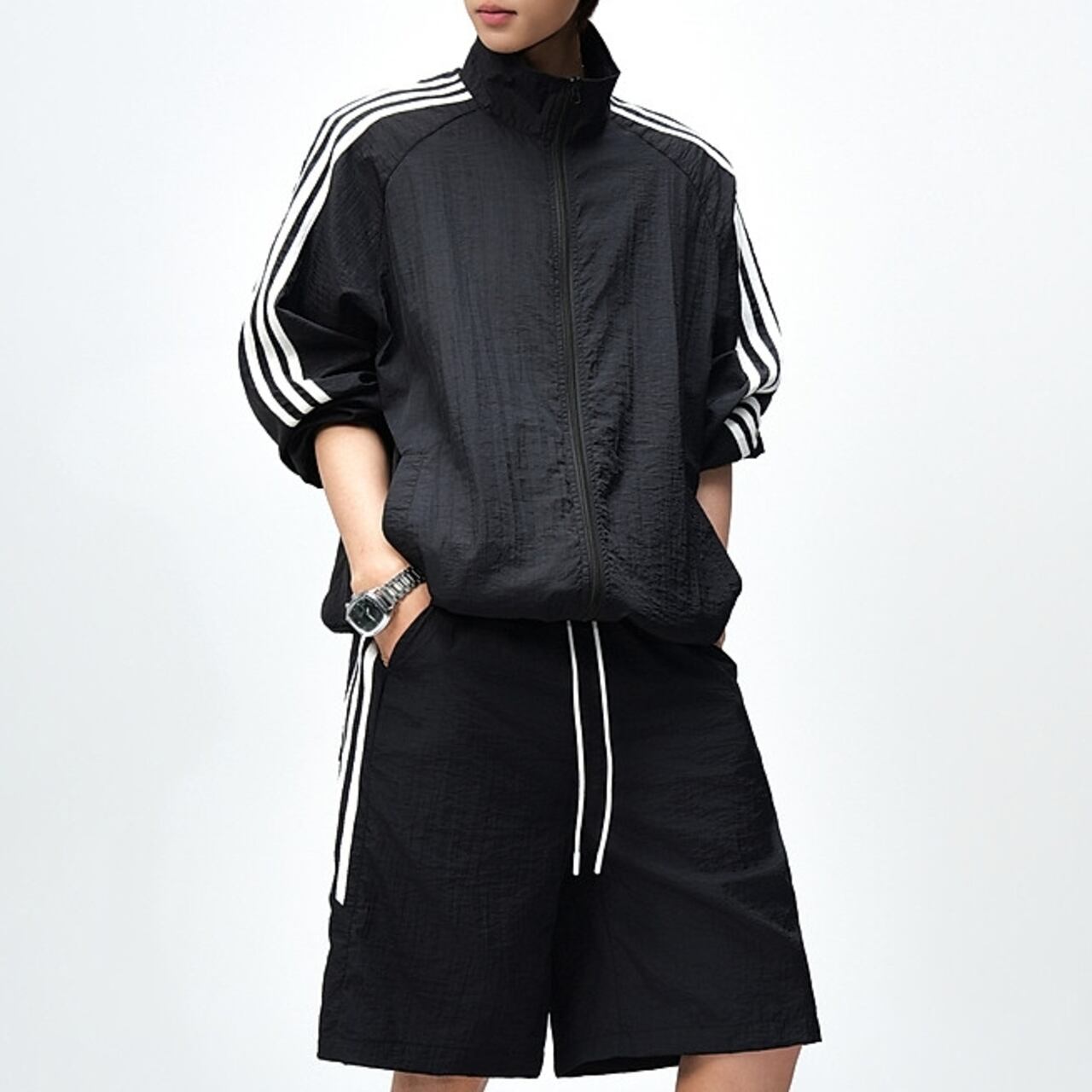 アクティブなシーンに最適な、ジップアップ長袖トラックジャケットとシンプルなハーフパンツ。
