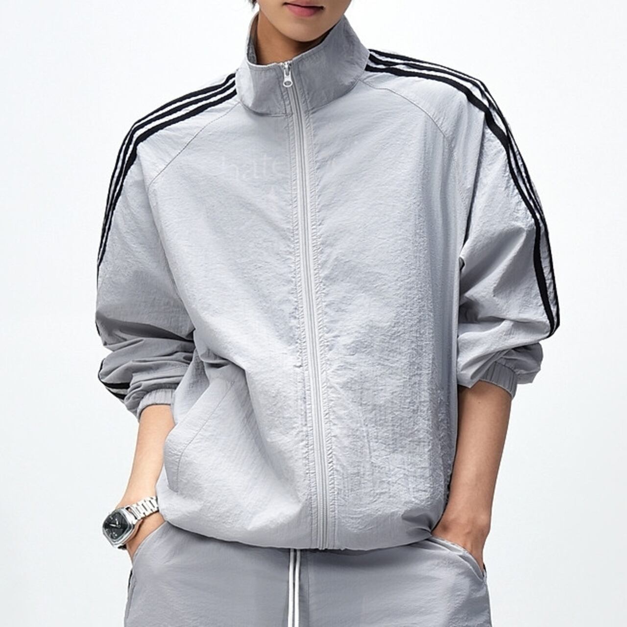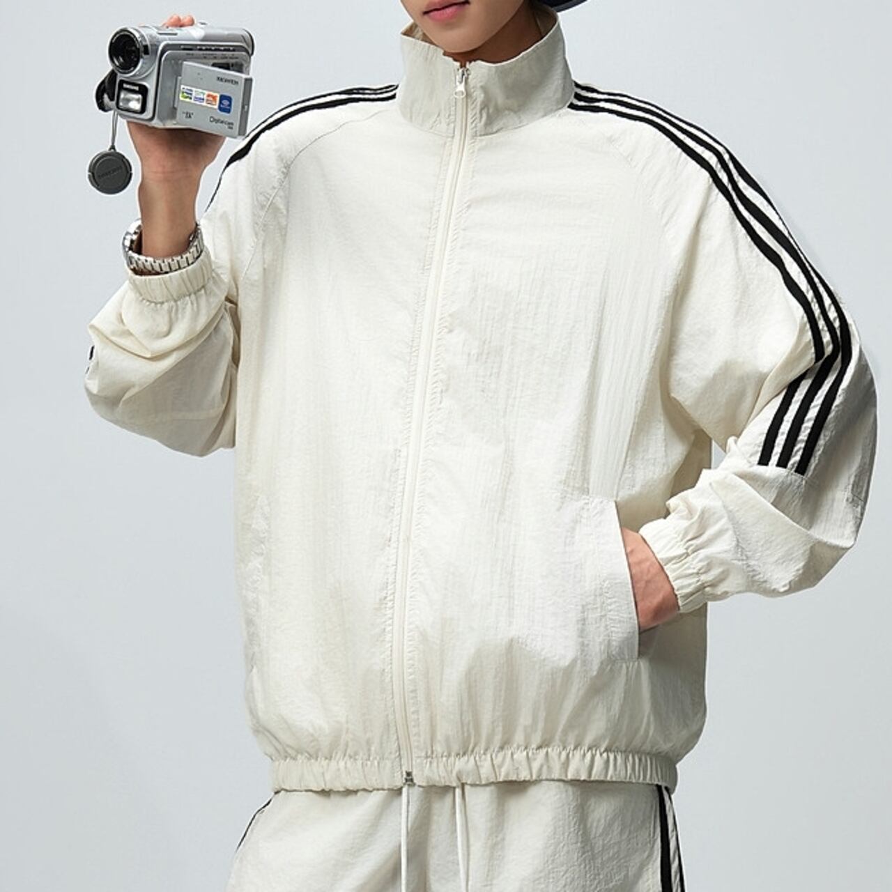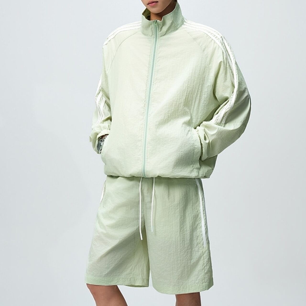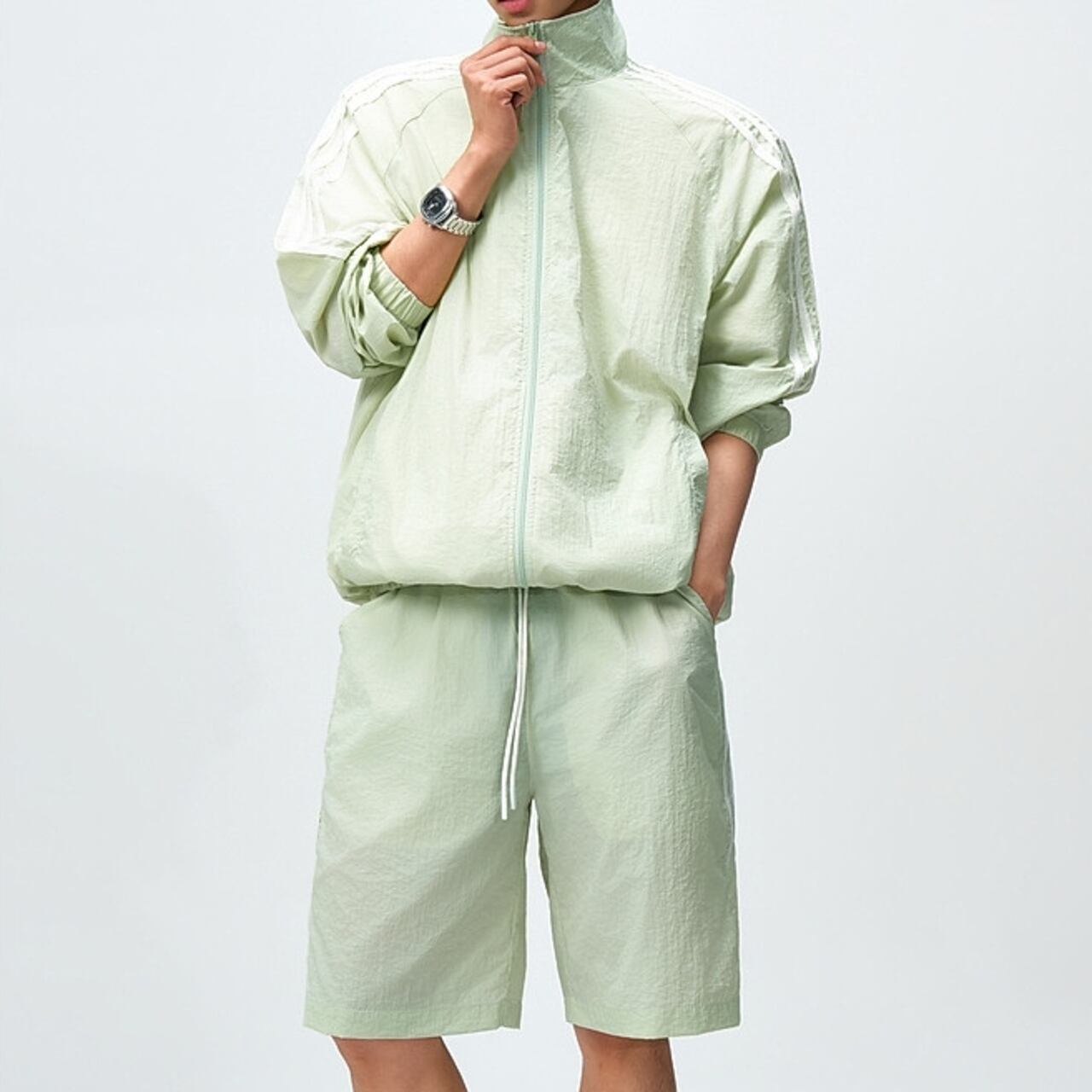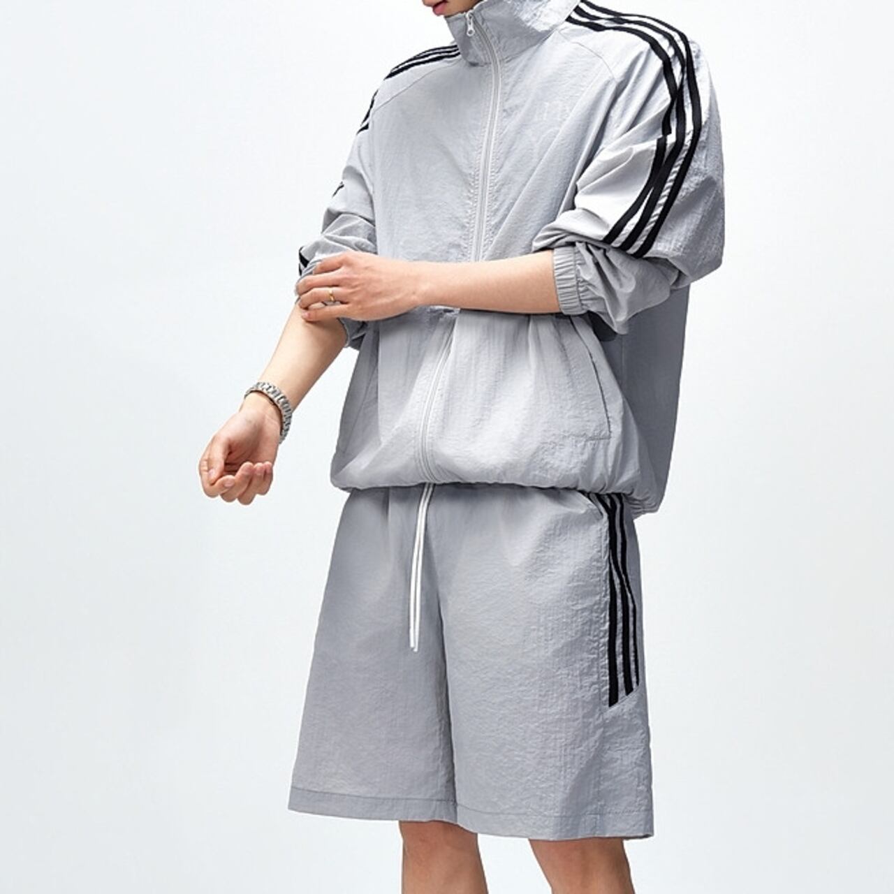 アクティブなシーンに最適な、ジップアップ長袖トラックジャケットとシンプルなハーフパンツ。
