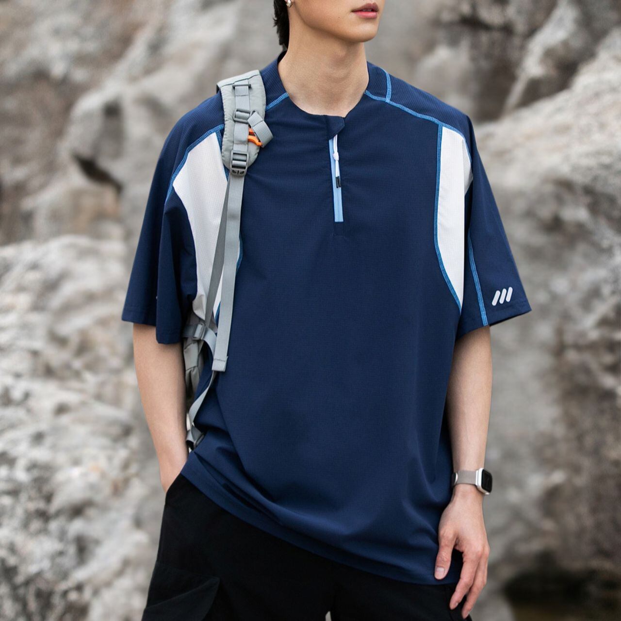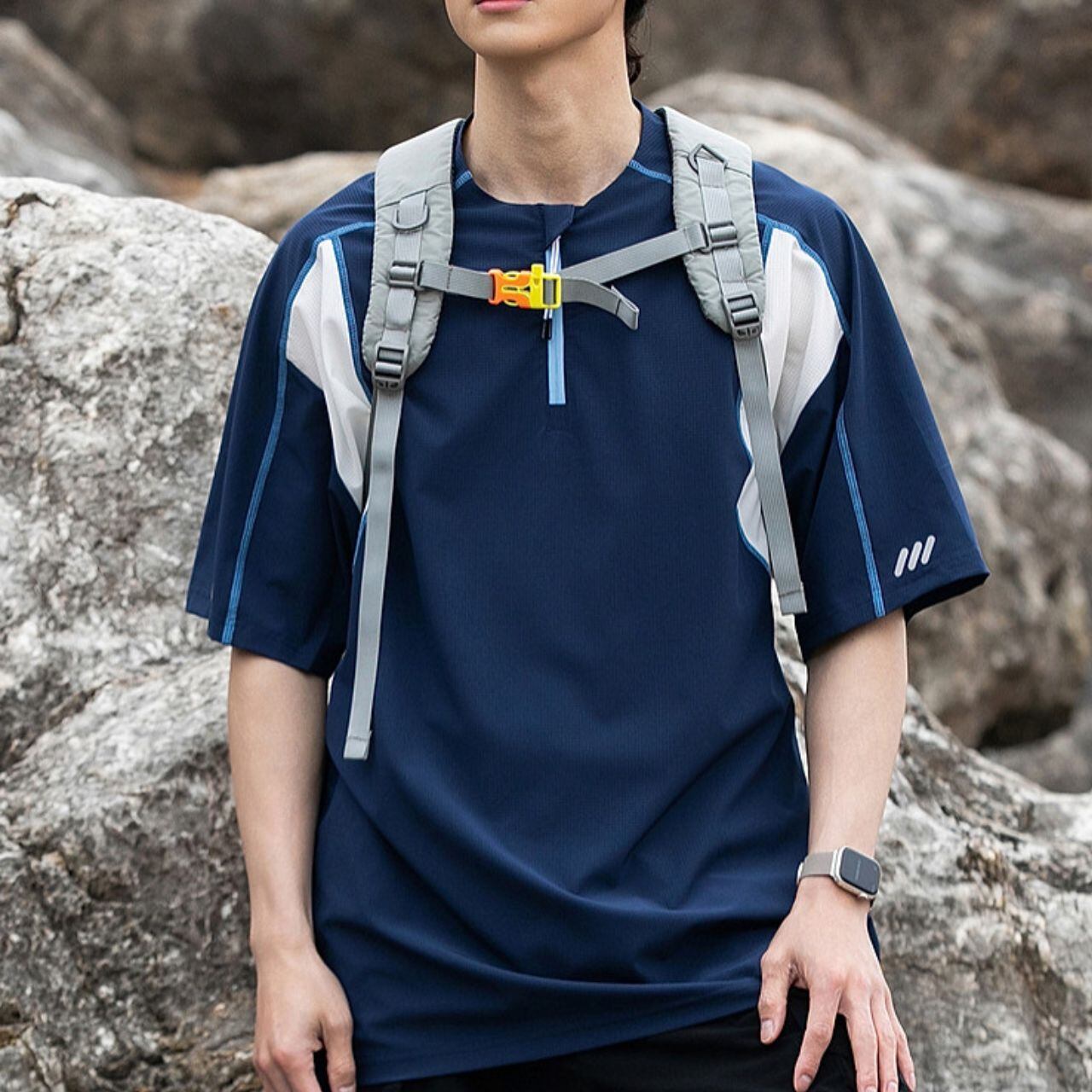 シンプルなデザインながら、ハーフジップとドロップショルダーでトレンド感のある半袖Tシャツ。着回し力が高く、様々なコーディネートに合わせやすい一枚です。ちょっとしたお出かけにも重宝します。